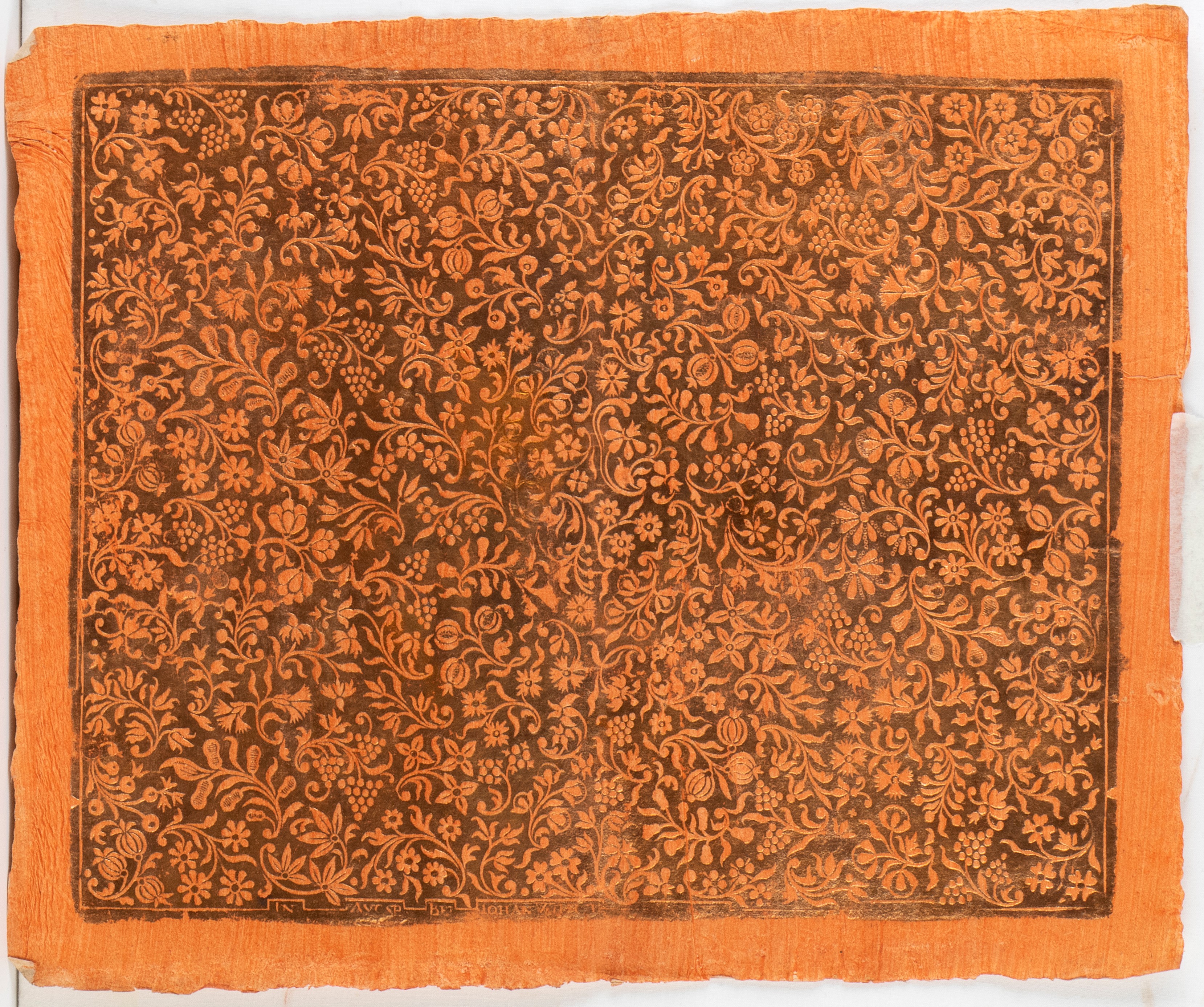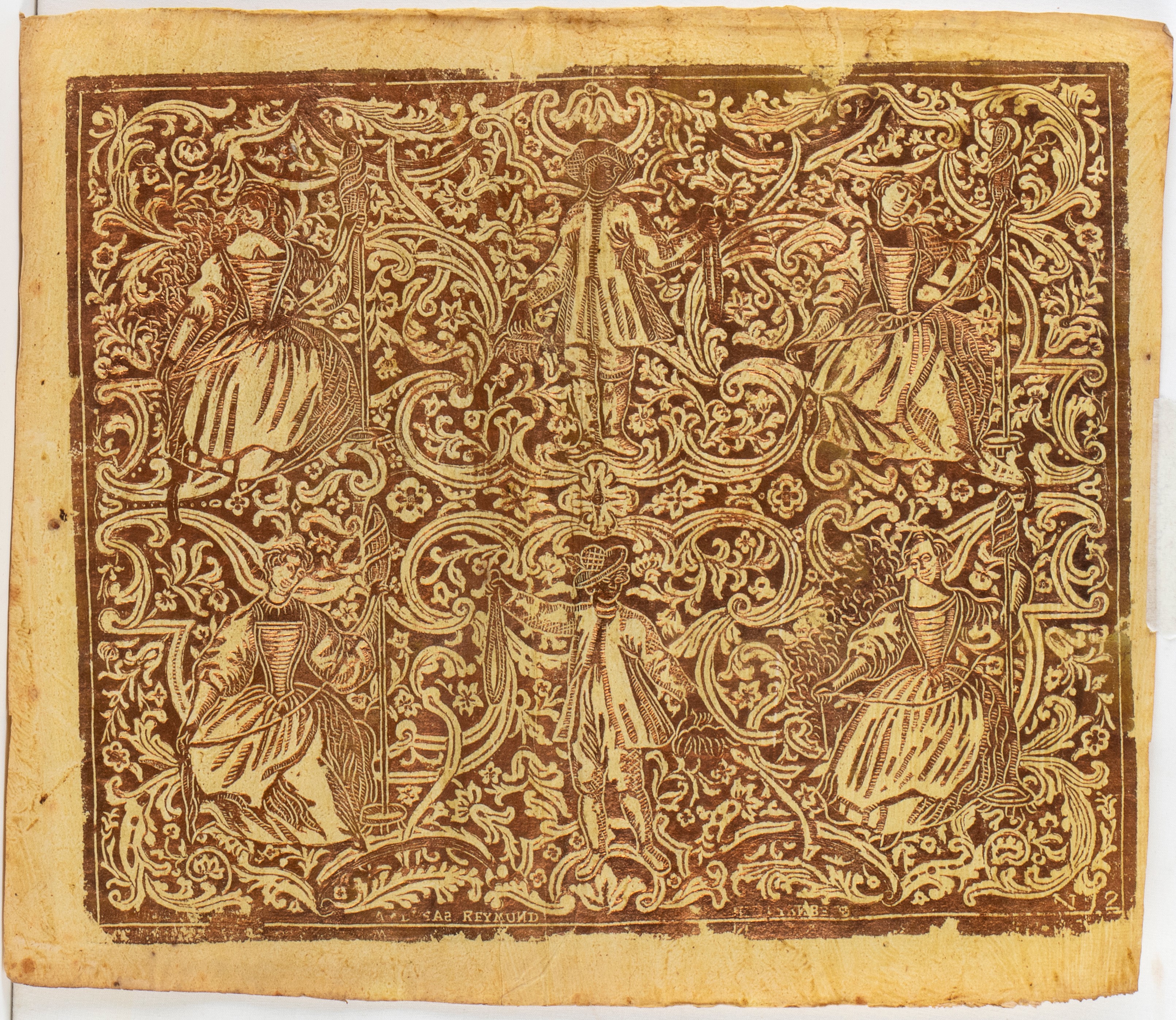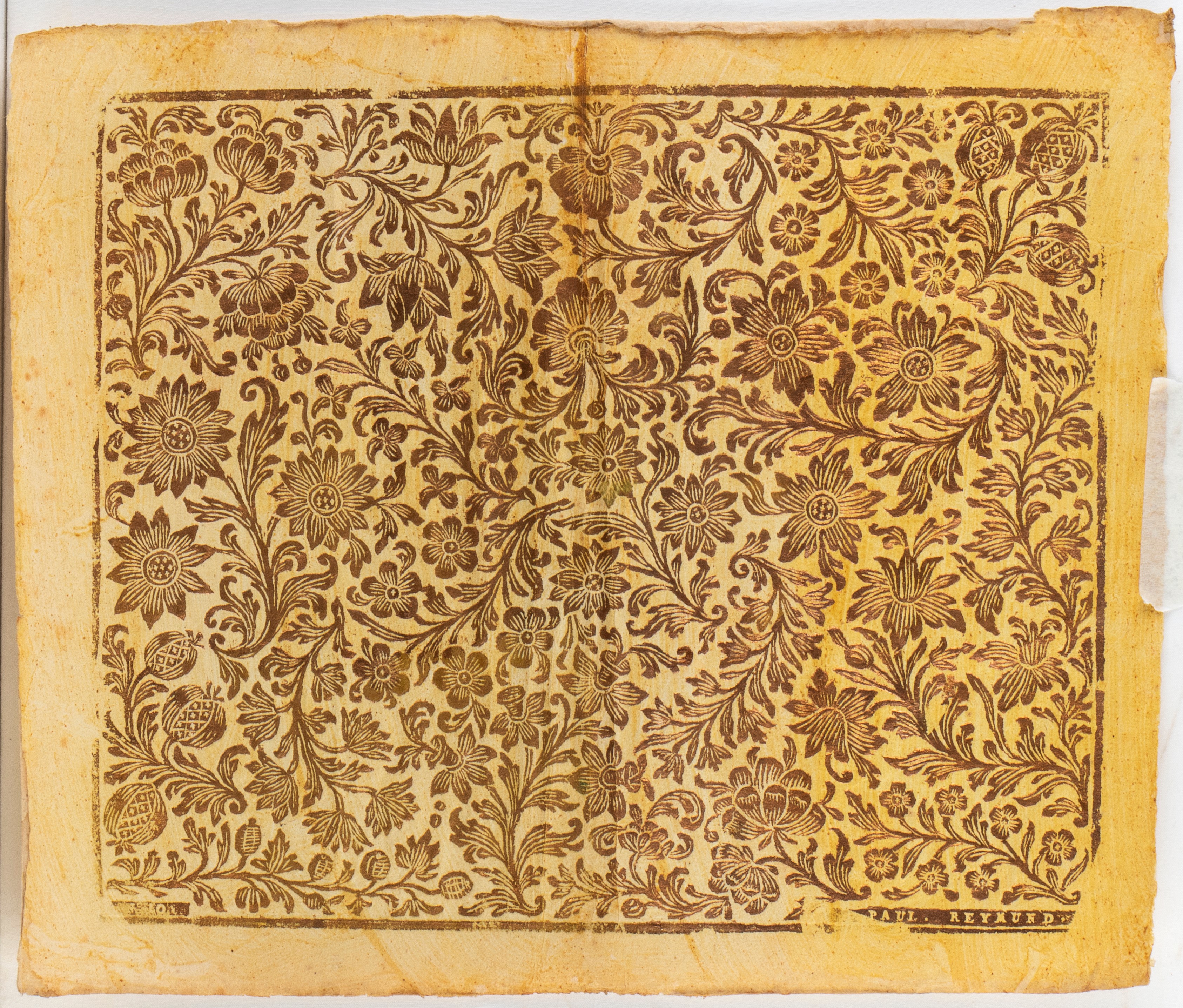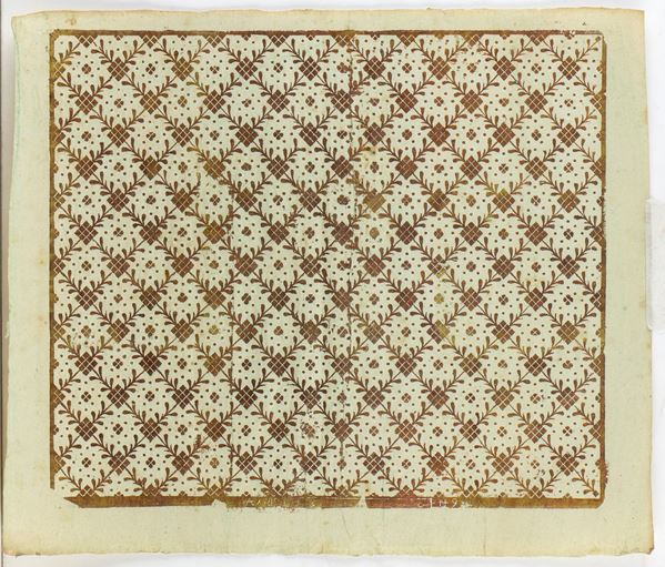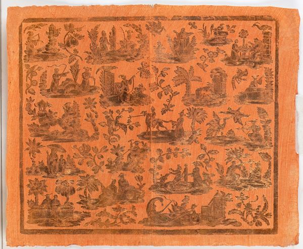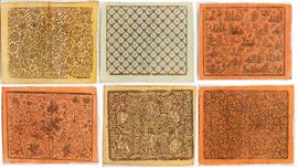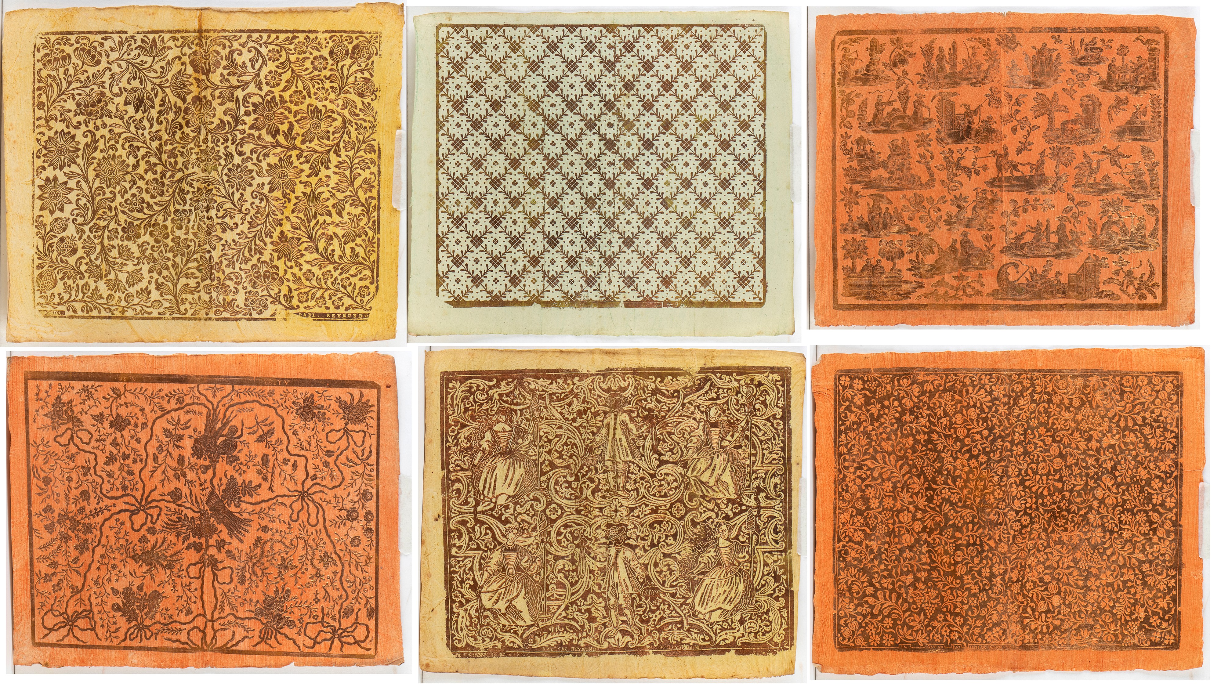 Lotto di sei carte da rivestimento. Xilografia, 355 x 415 mm ca. (cad. foglio).