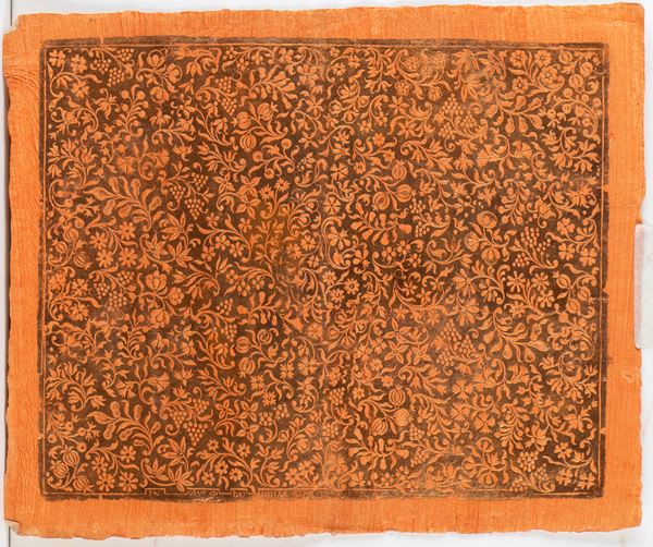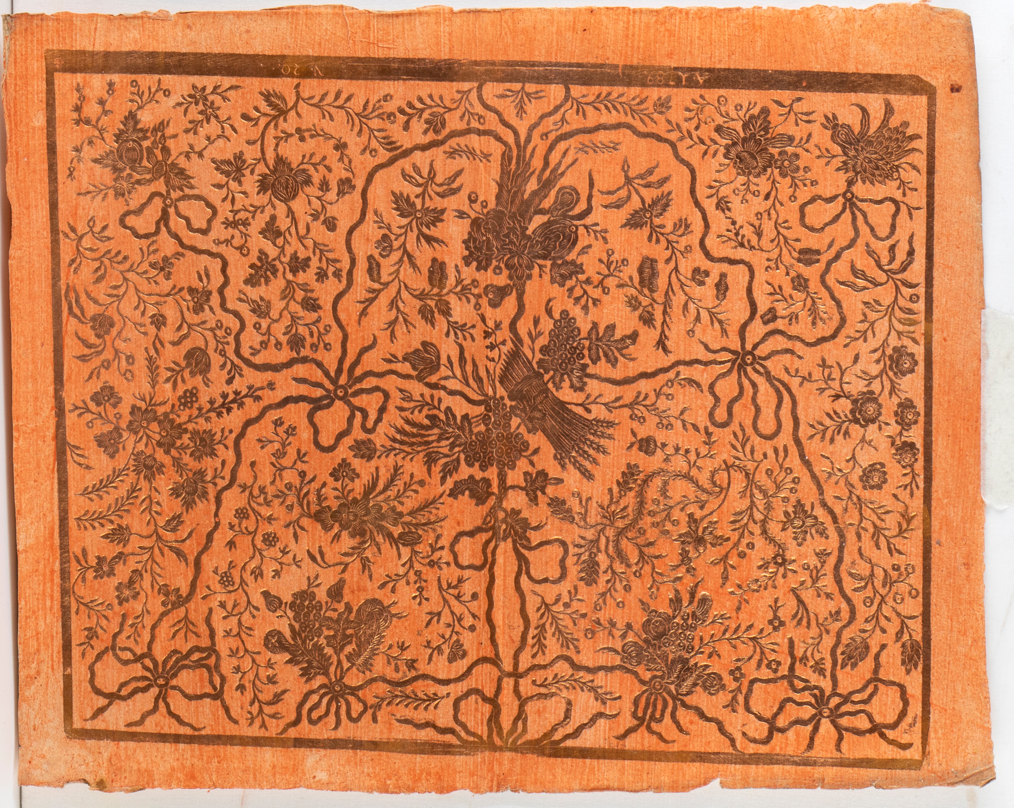 Carta dorata e goffrata. Impressione con inchiostro metallico dorato su carta vergata preparata di varii colori. Ottimo stato di conservazione generale.