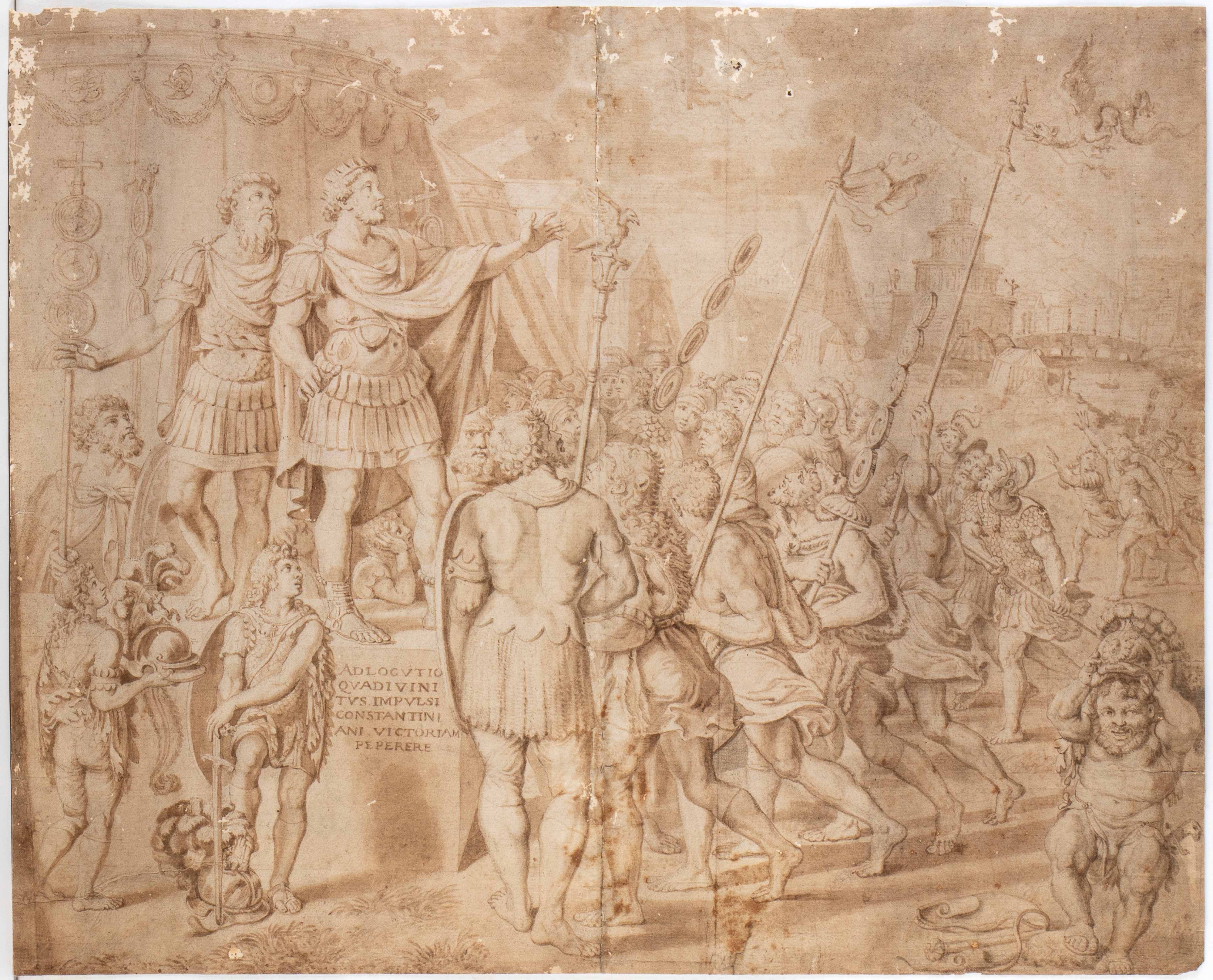 Il disegno reca iscrizione sulla base del piedistallo di Costantino: "ADLOCUTIO / QUA DIVINI / TUS IMPULSI / COSTANTINI / ANI VICTORIAM / PEPERERE".