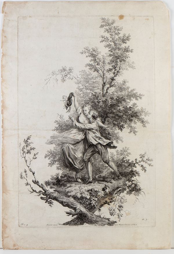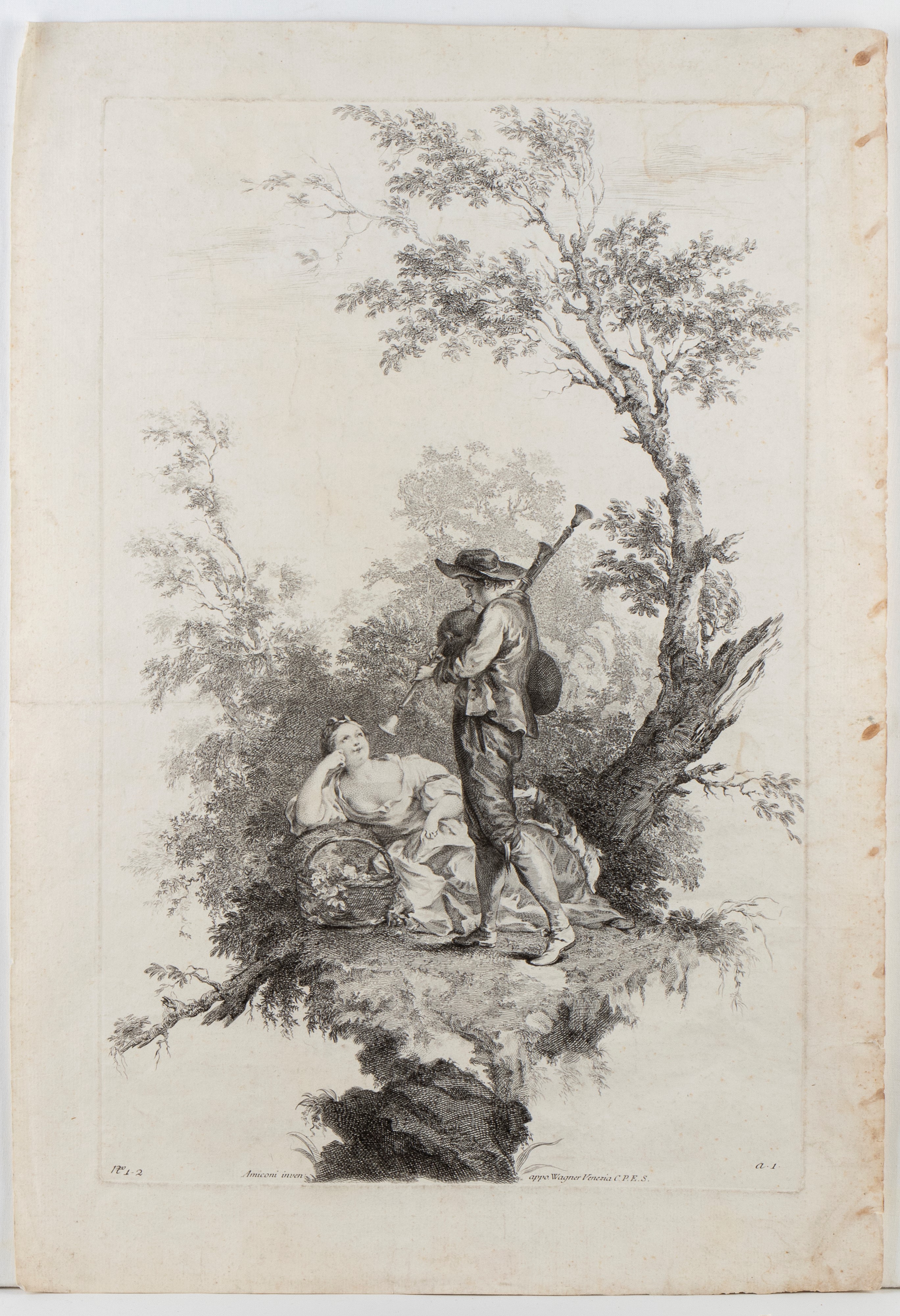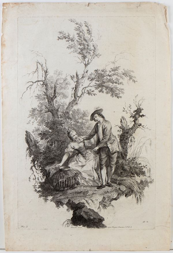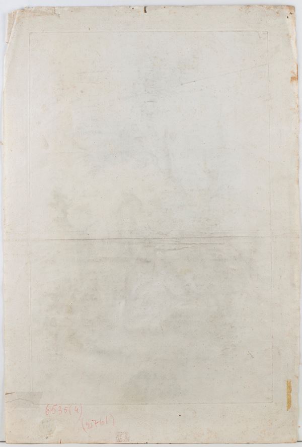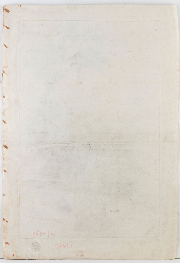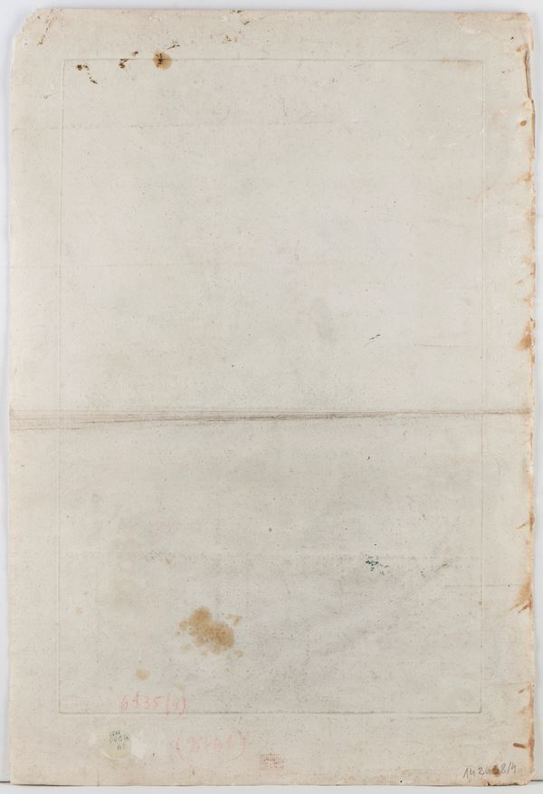 Belle impressioni su carta vergata con filigrana letteraria. Esemplari con grandi margini oltre alla battuta della lastra. Presentano alcune pieghe, sgualciture macchie e difetti lunghi i bordi, ma nel complesso in buono stato.