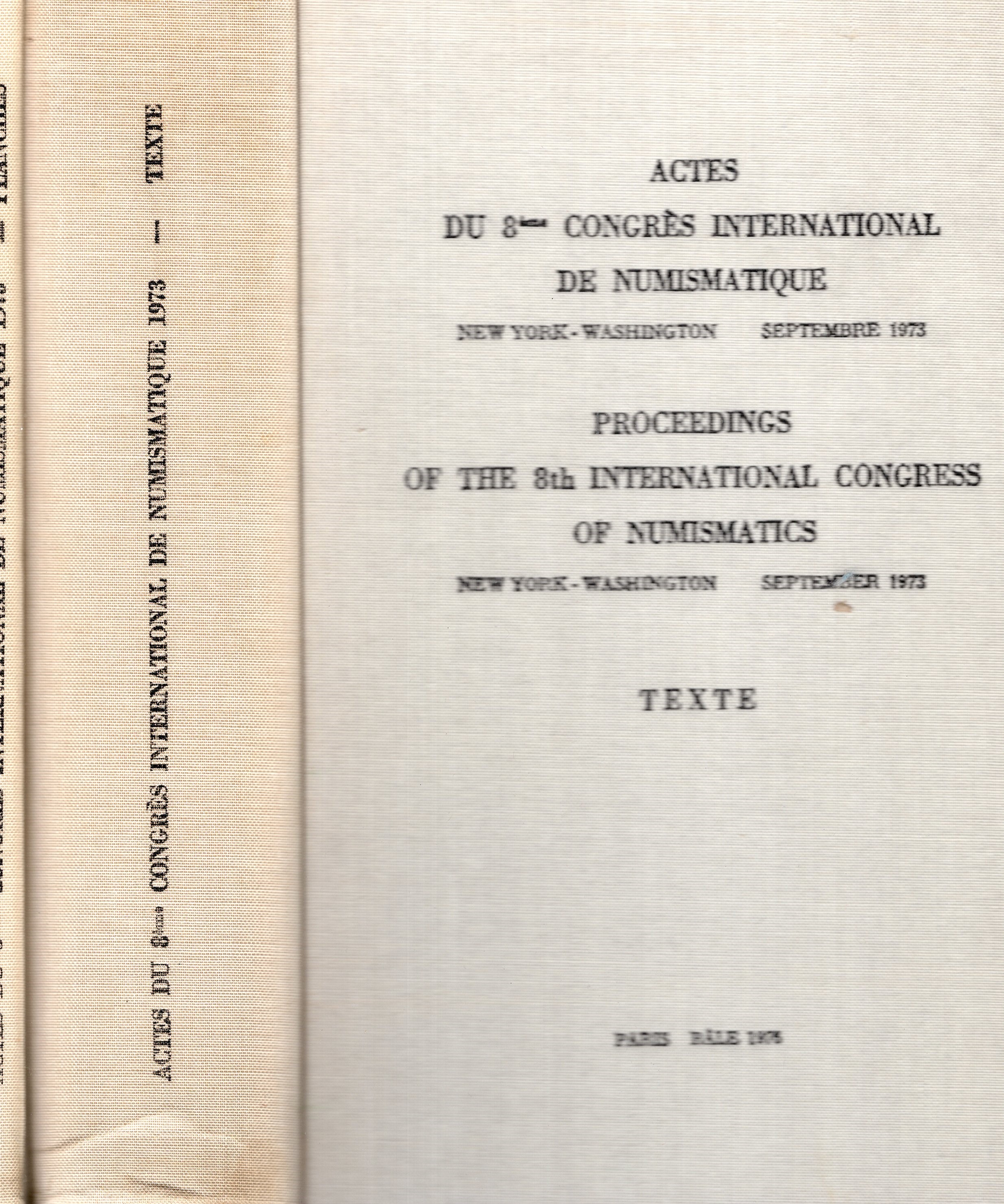 AA.-VV. - Actes du 8 Congres international de Numismaitque. New York - Washington, Septembre, 1973. 2 volumi completo. Paris-Bale, 1976. pp xiv - 683, tavv. 77 + illustrazioni nel testo. rilegatura editoriale, buono stato. importanti contributi numismati