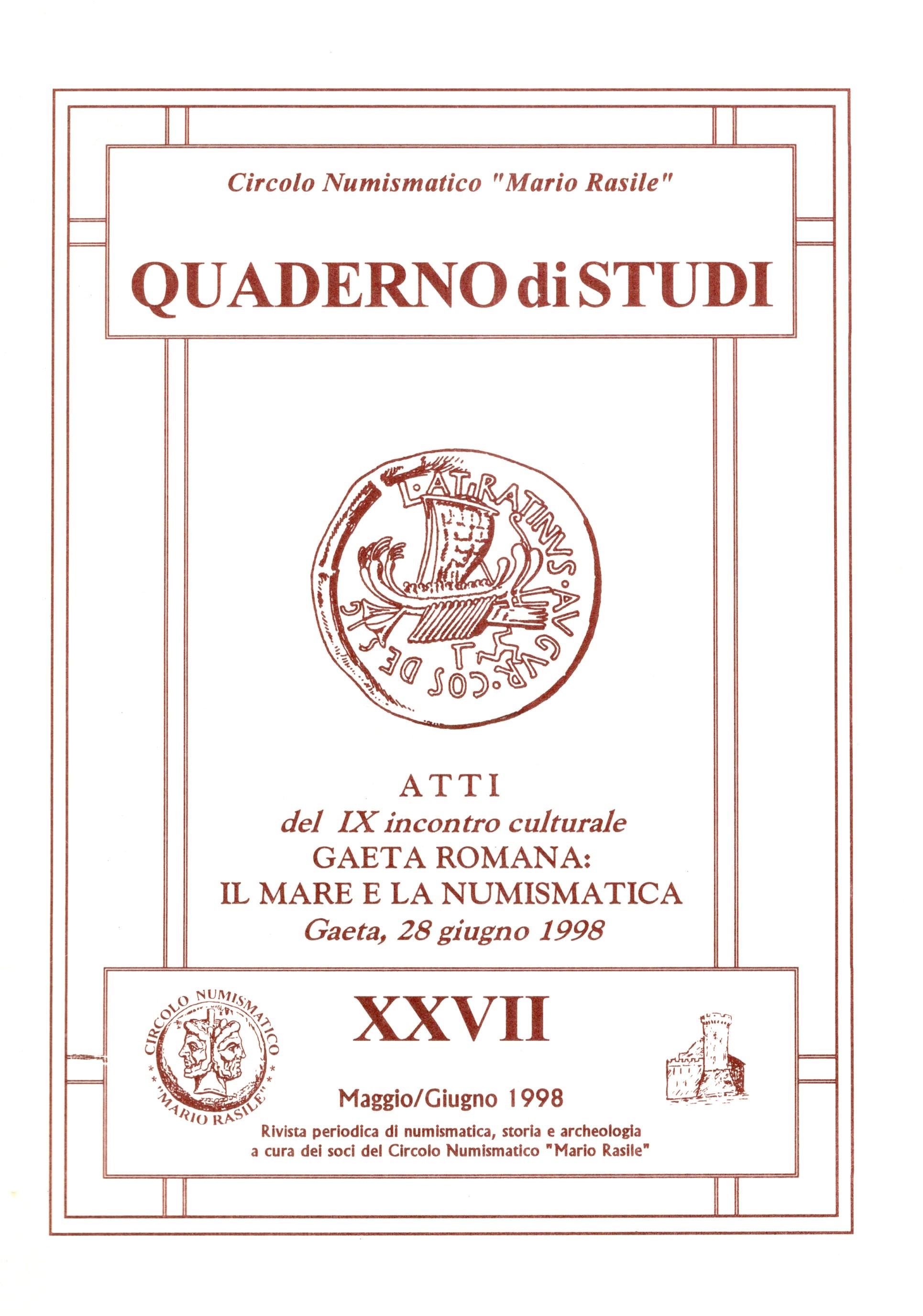 AA.-VV. - Atti del IX incontro culturale GAETA ROMANA: il mare e la numismatica. Gaeta, 28 - Giugno, 1998. Quaderni di studi XXVII 1998. pp 68, illustrazioni nel testo. Legatura ed. ottimo stato, importanti lavori.