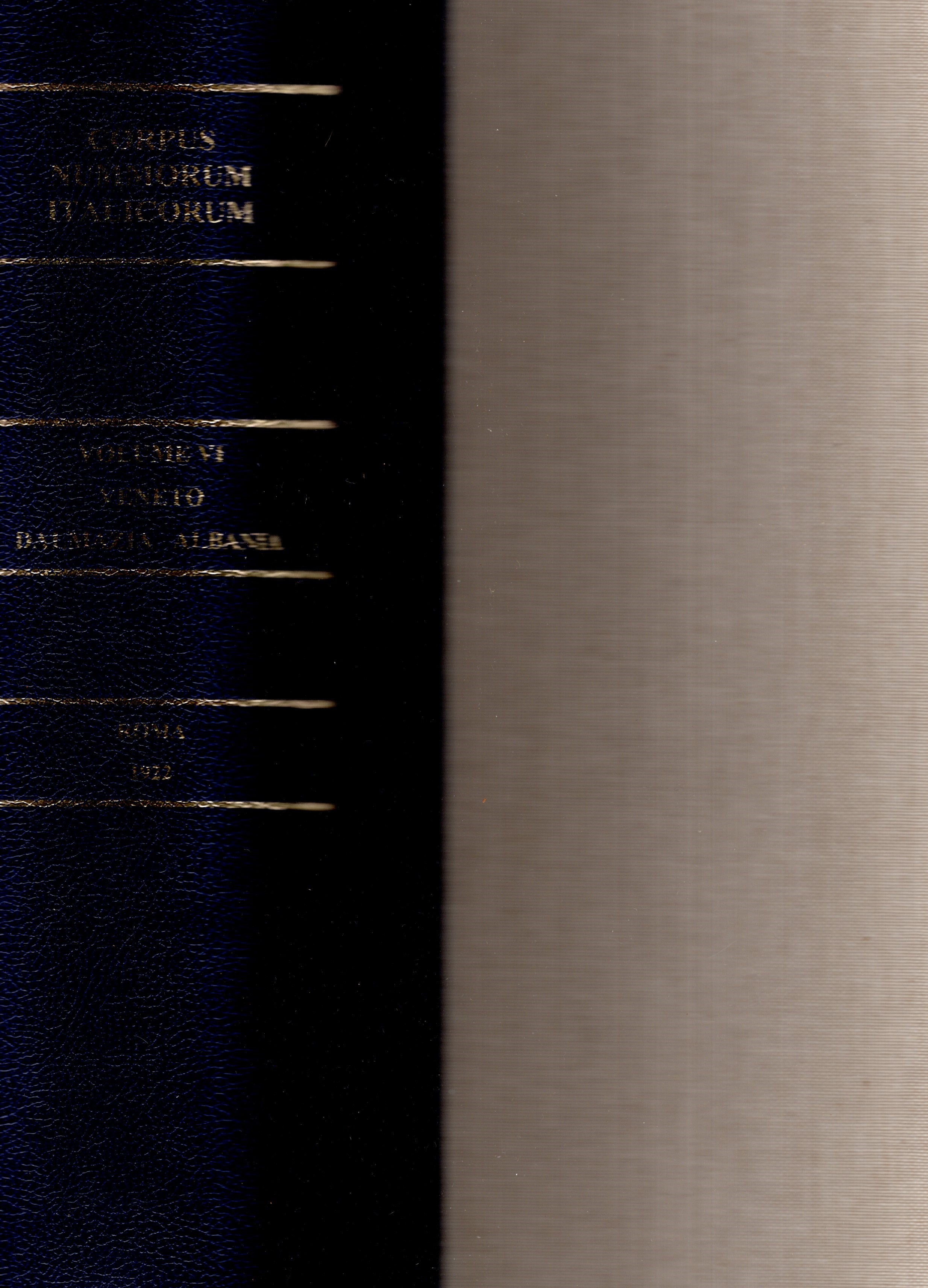 A.A.V.V. - Corpus Nummorum Italicorum. Vol. VI. Veneto. Zecche Minori Dalmazia - Albania. Roma, 1922. pp 682, tavole 35. Legatura rigida in canapa e \ similpelle, interno ottimo stato, conservate le brossura, molto raro e ricercato..