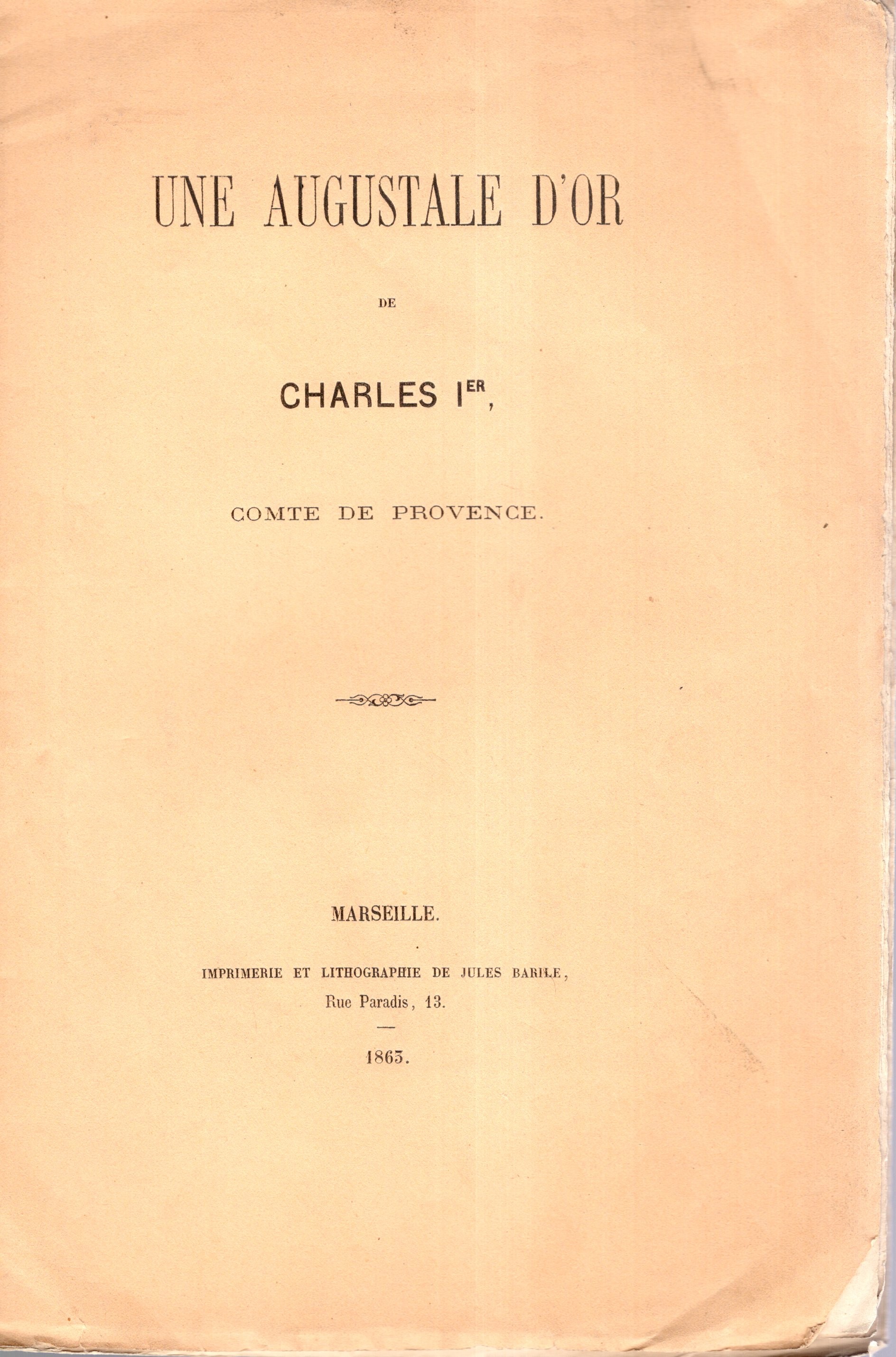 CARPENTIN Ad - Une Augustale d'or de Charles I. Comte de Provence. Marseille, 1863. pp 12, plates 1. Brossura ed sciupata, interno buono stato, raro.