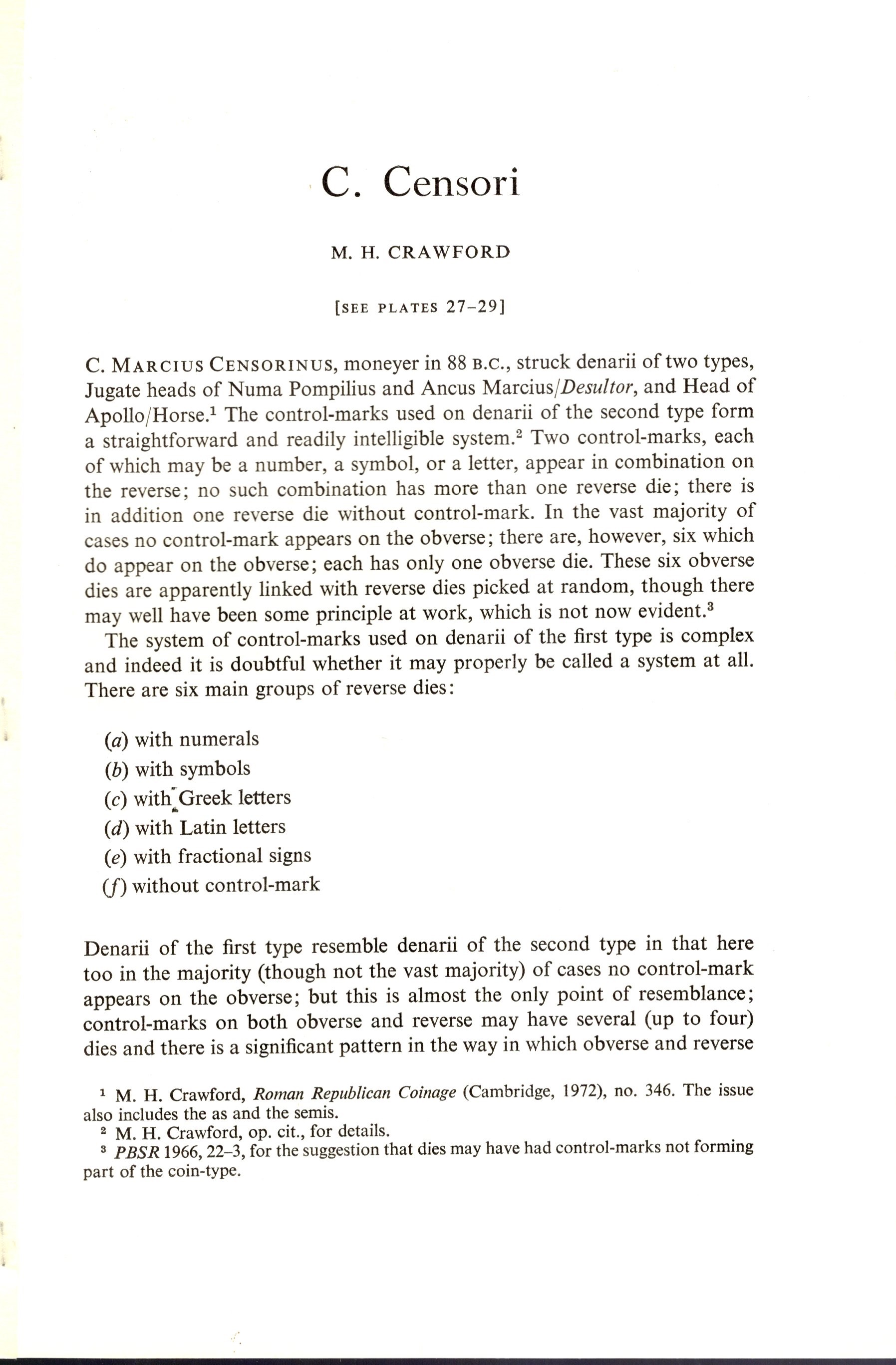 CRAWFORD M. H. - C. CENSORI. London, 1971. pp 143-149, plates 3. Brosura sciolta, ottimo stato, importante lavoro.