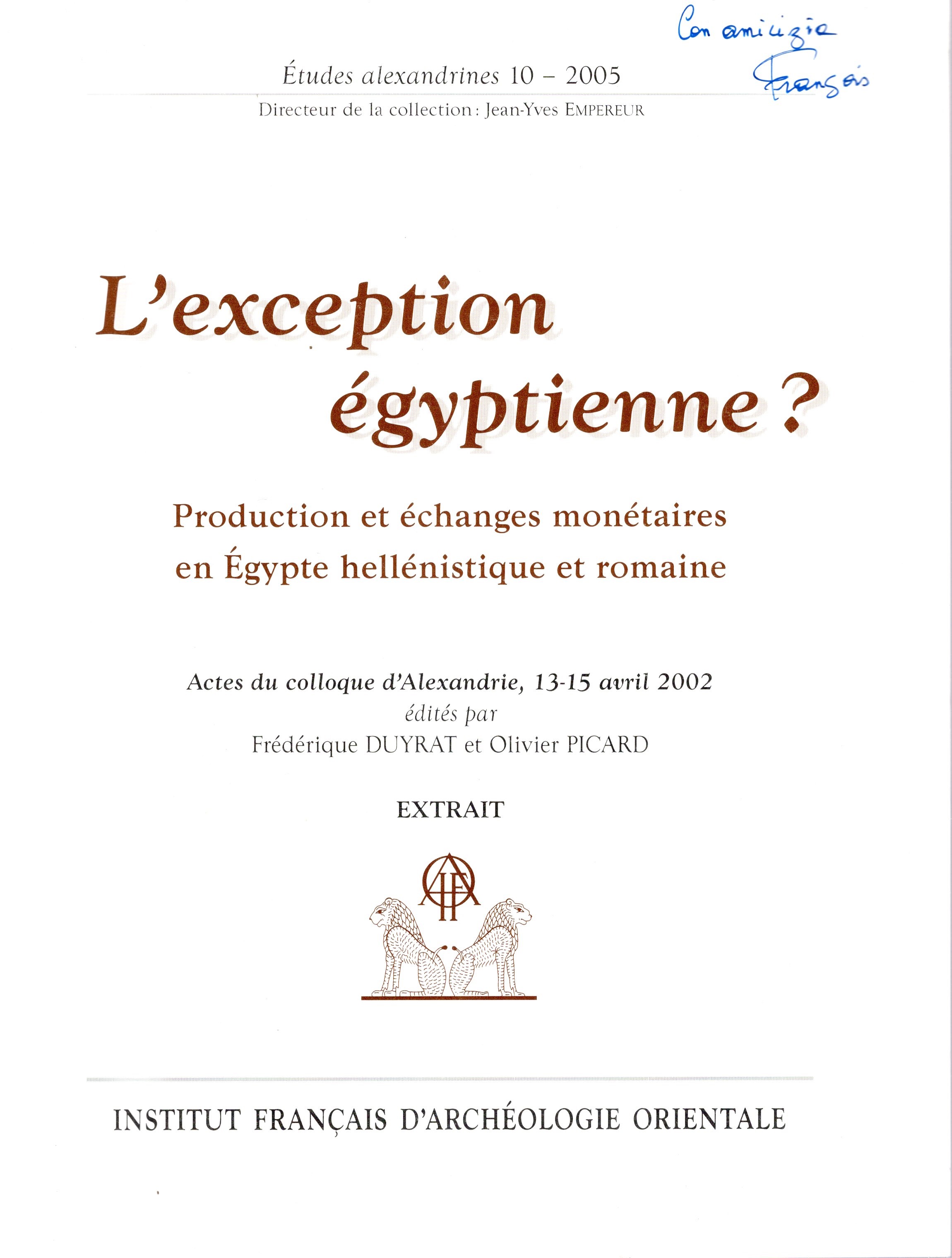 DE CALLATAY Francois - L'instauration par Ptolémée I Soter d'une économie monétaire fermée. Paris, 2002. pp 117-134, plates 1. Brossura ed. ottimo stato.