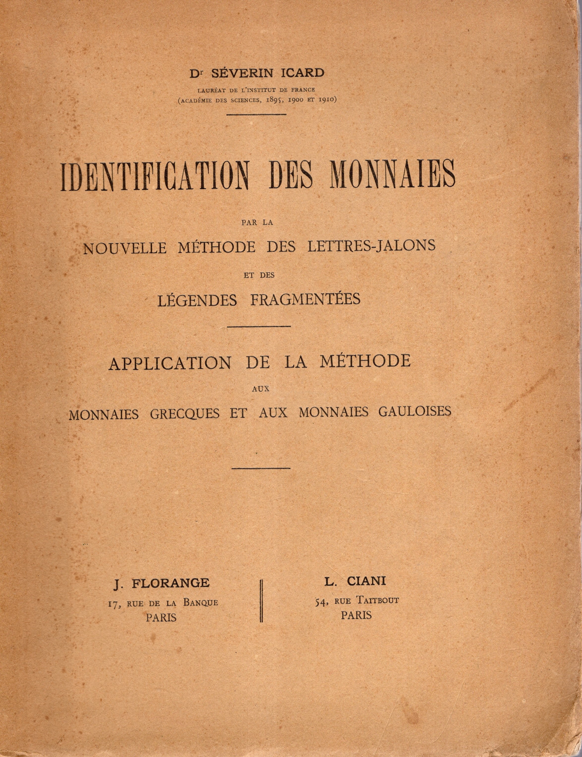 ICARD Severin - Identification des monnaies par la nouvelle methode des lettres-jalons et des legend fragmentees. Application de la methode aux monnaies grecques et aux monnaies galuoises. Paris, 1929. pp xxiv - 563, tavole 2 di alfabeti. Legatura ed. sci