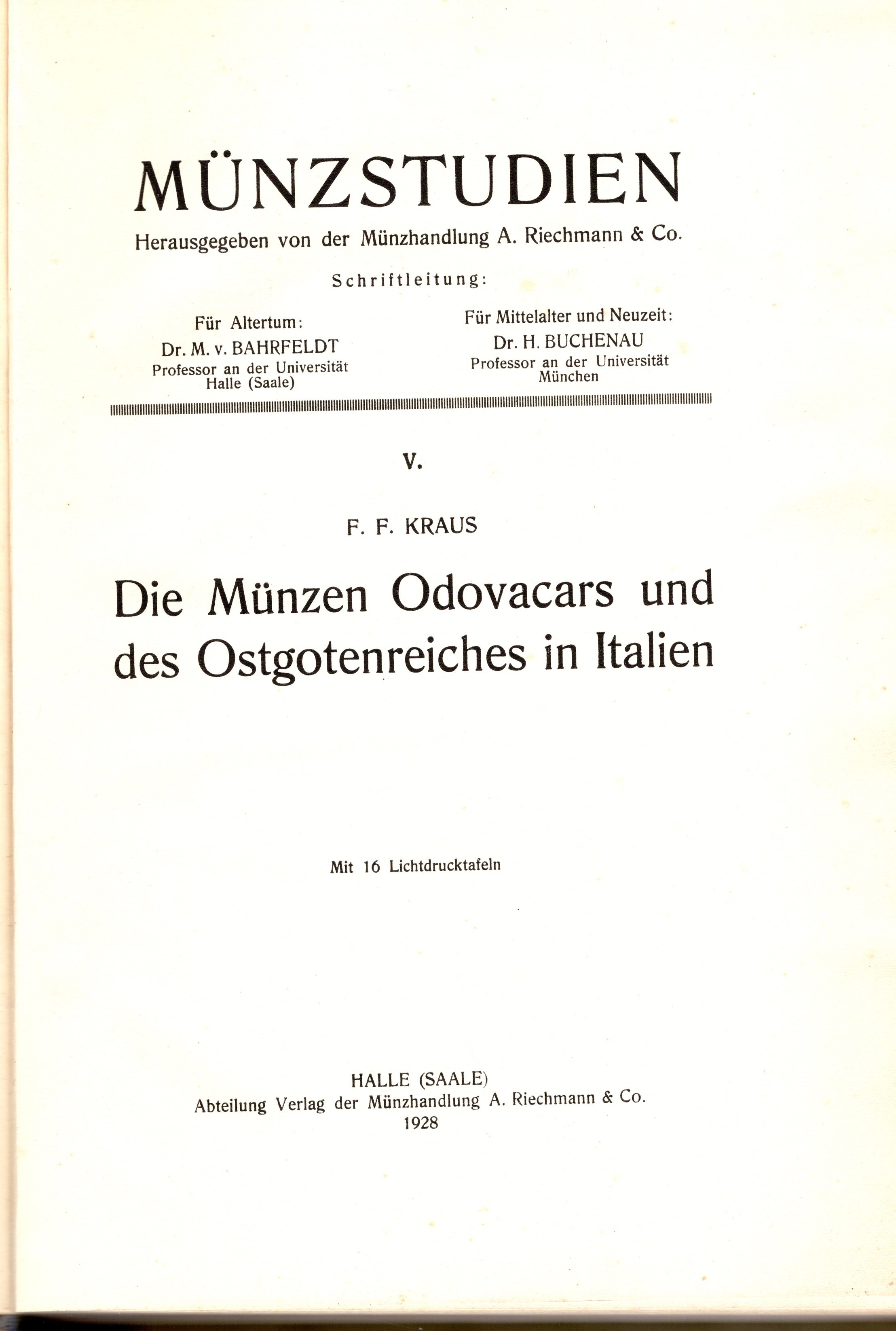 KRAUS F.F. - Die munzen Odovacars und des Ostgotenreiches in Italien. Halle – Salle, 1928 Pp.xiii, 227, + 2 di monogrammi, tavv. 15 + 1. Ril. \ tela cartonato rigido, ottimo stato.