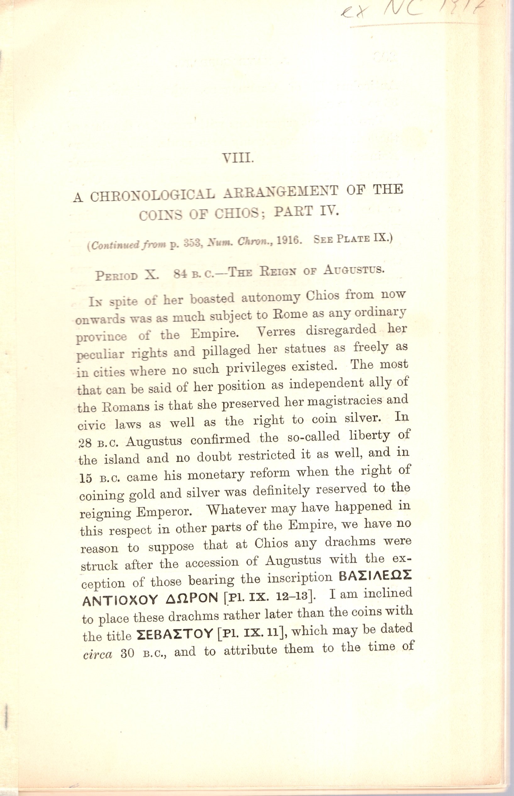 MAVROGORDATO J. - A cronological arrangement of the coins of Chios: Part IV. Numismatic Chronicle London, 1917. pp 207 - 256, plates 1. Brossura ed. sciupata, interno ottimo stato, molto raro.