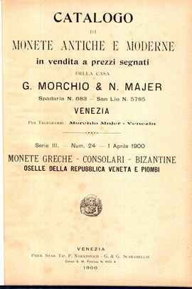 MORCHIO G. - MAJER N. - Catalogo di monete antiche a prezzi segnati n 24 - 1 - Aprile, 1900. Monete greche, romane consolari, bizantine, oselle della repubblica veneta e piombi. Pp 71, lots 2439. Legatura rigida tutta similpelle con scritte sul dorso, int