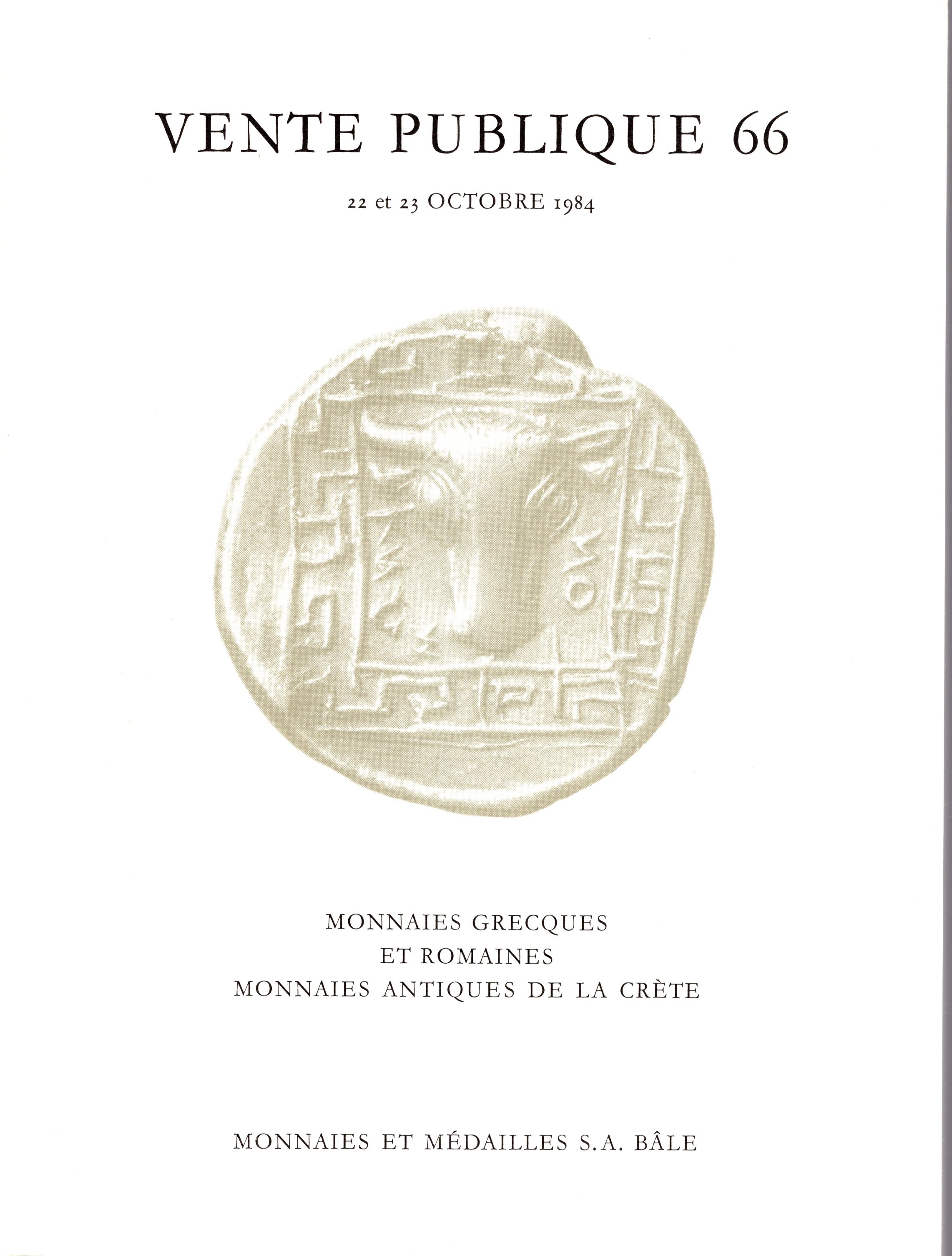 MUNZEN UND MEDAILLEN S.A. - Vente publique 66. Basel, 22\23 October, 1984. Monnaies grecques et Romaines. Monnaies antiques de la Crète. Pp 104, lots 886, plates 58. Brossura ed. ottimo stato.
