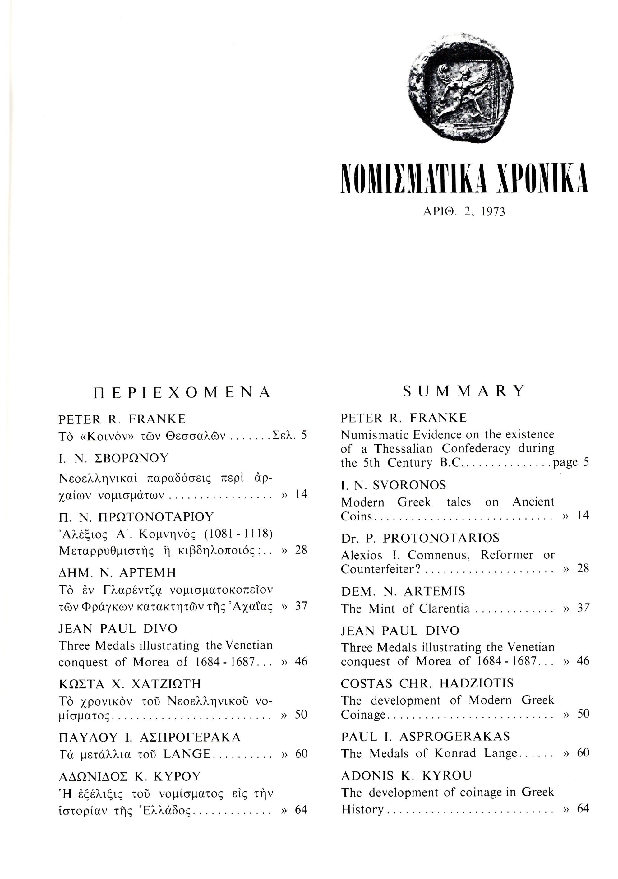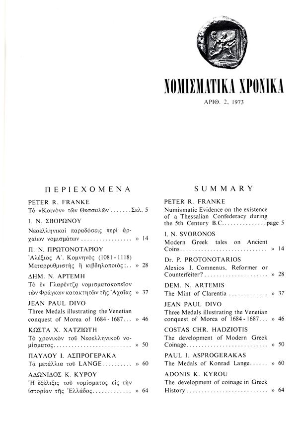 NOMISMATIKA CHRONICA - Athens, 1973. pp 73, molte illustrazioni nel testo. Legatura ed. buono stato, riassunti in inglese. Da notare il lavoro dello Svoronos sulle falsificazioni moderne di monete antiche.