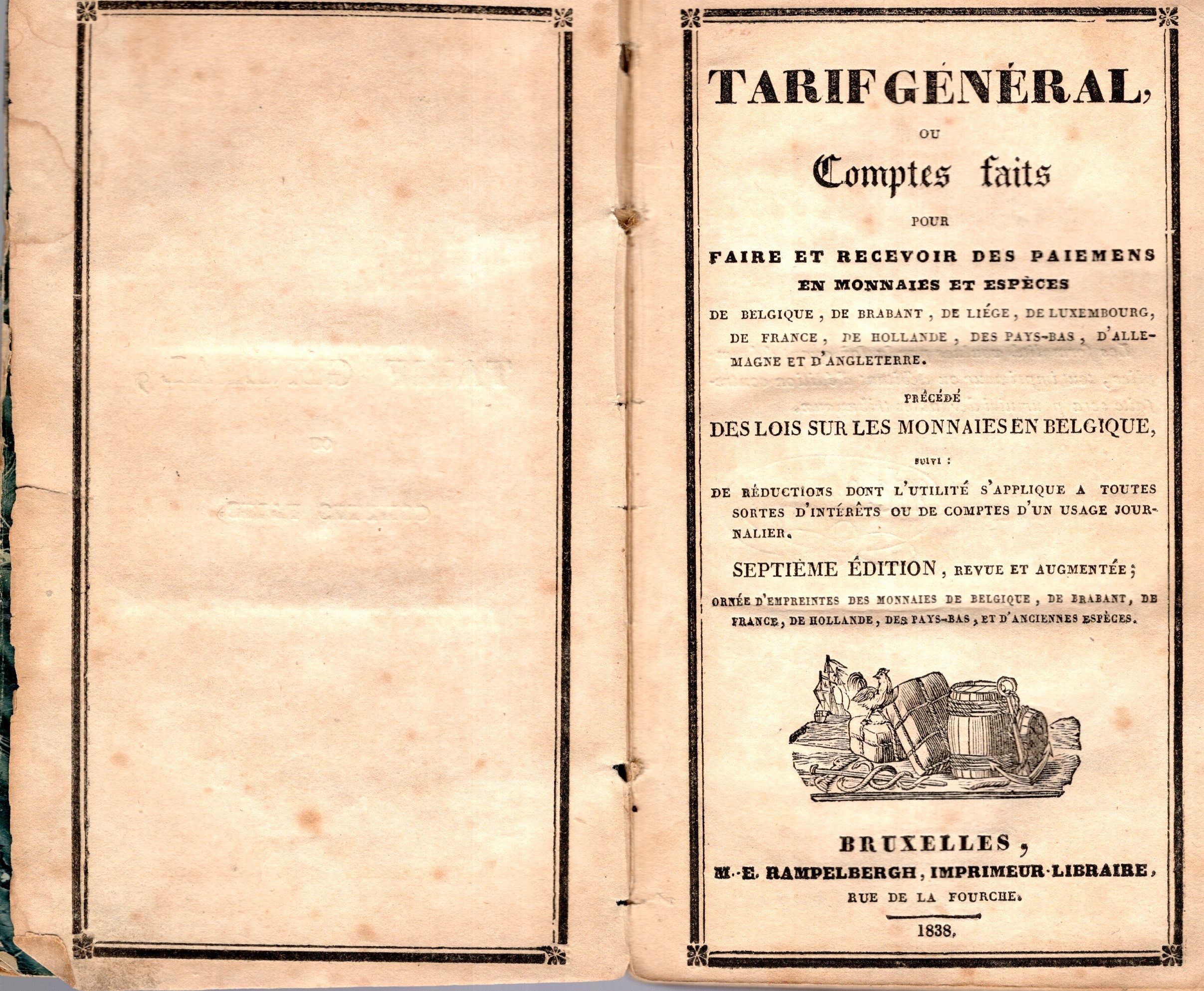 RAMPELBERGH E. - Tarif general ou comptes faits pour faire et recevoir des paiements en monnaies et especes de Belgique,de Brabant, de Liege, de Luxembourg, de France, de Hollande, de Pays-Bas, d'Allemagne et d'Angleterre precede des loi sur les monnaies