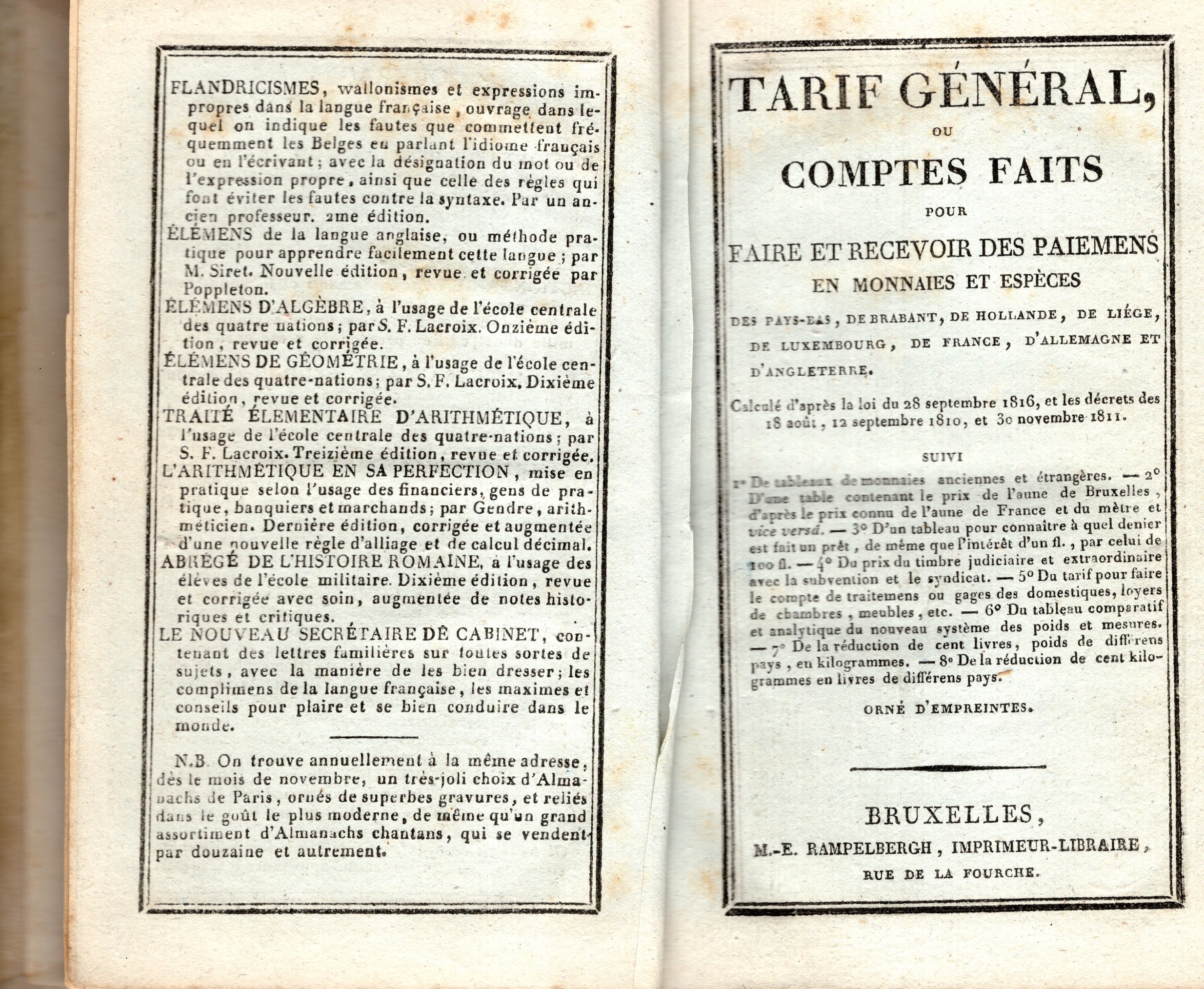 RAMPELBERGH E. - Tarif general ou comptes faits pour faire et recevoir des paiements en monnaies et especes de Belgique,de Brabant, de Liege, de Luxembourg, de France, de Hollande, de Pays-Bas, d'Allemagne et d'Angleterre precede des loi sur les monnaies