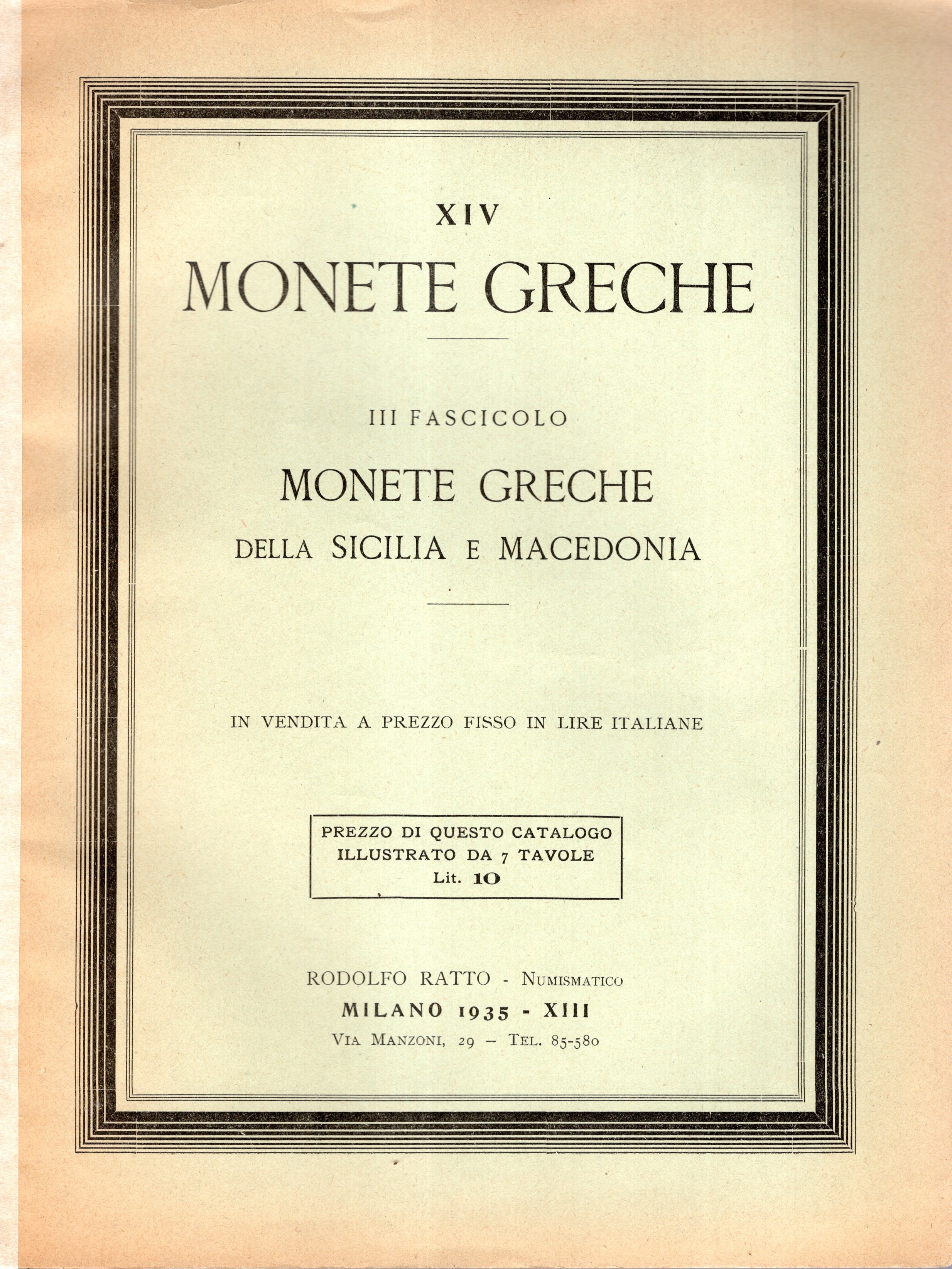 RATTO R. – Milano, 1935. Fascicolo XIV Listino a prezzi fissi III fascicolo. Monete greche della Sicilia e Macedonia. Pp. 33 – 48, nn. 1083 – 1617, tavv. 15 – 21. Ril. ed. sciupata, interno buono stato, molto raro Spring nota pag. 203 Rossi, 2912