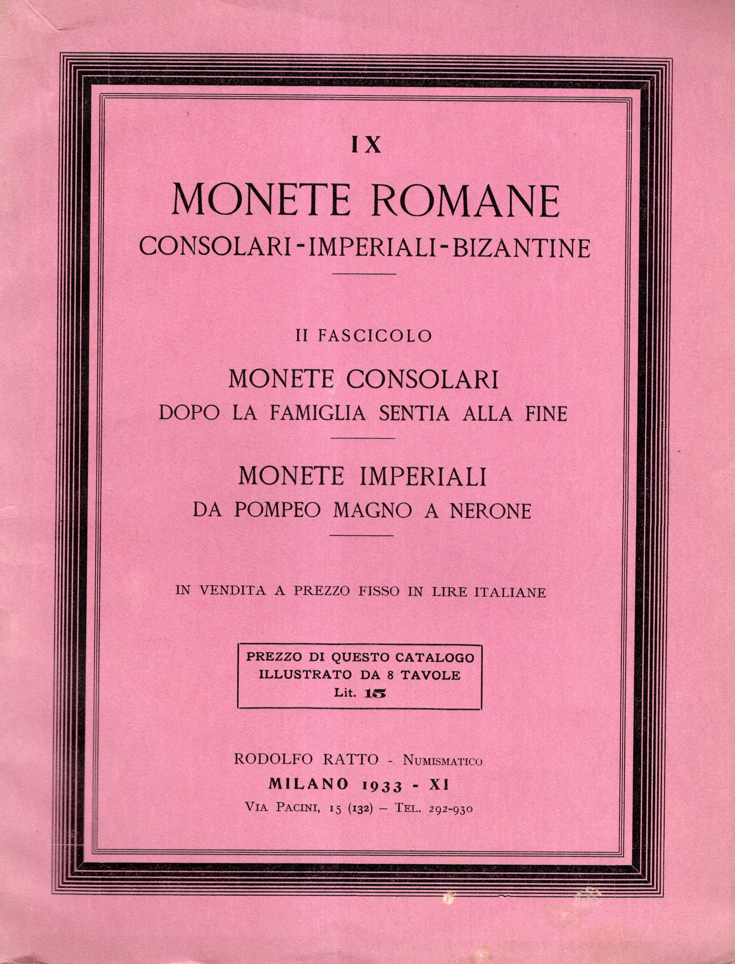 RATTO Rodolfo – Milano, 1933. Listino a prezzi fissi N IX. Monete romane consolari, imperiali. II fasc. Monete consolari dopo la famiglia Sentia alla fine. Monete imperiali da Pompeo Magno a Nerone. Pp.24, lots 828 - 1629, plates 8. Brossura ed. sciup