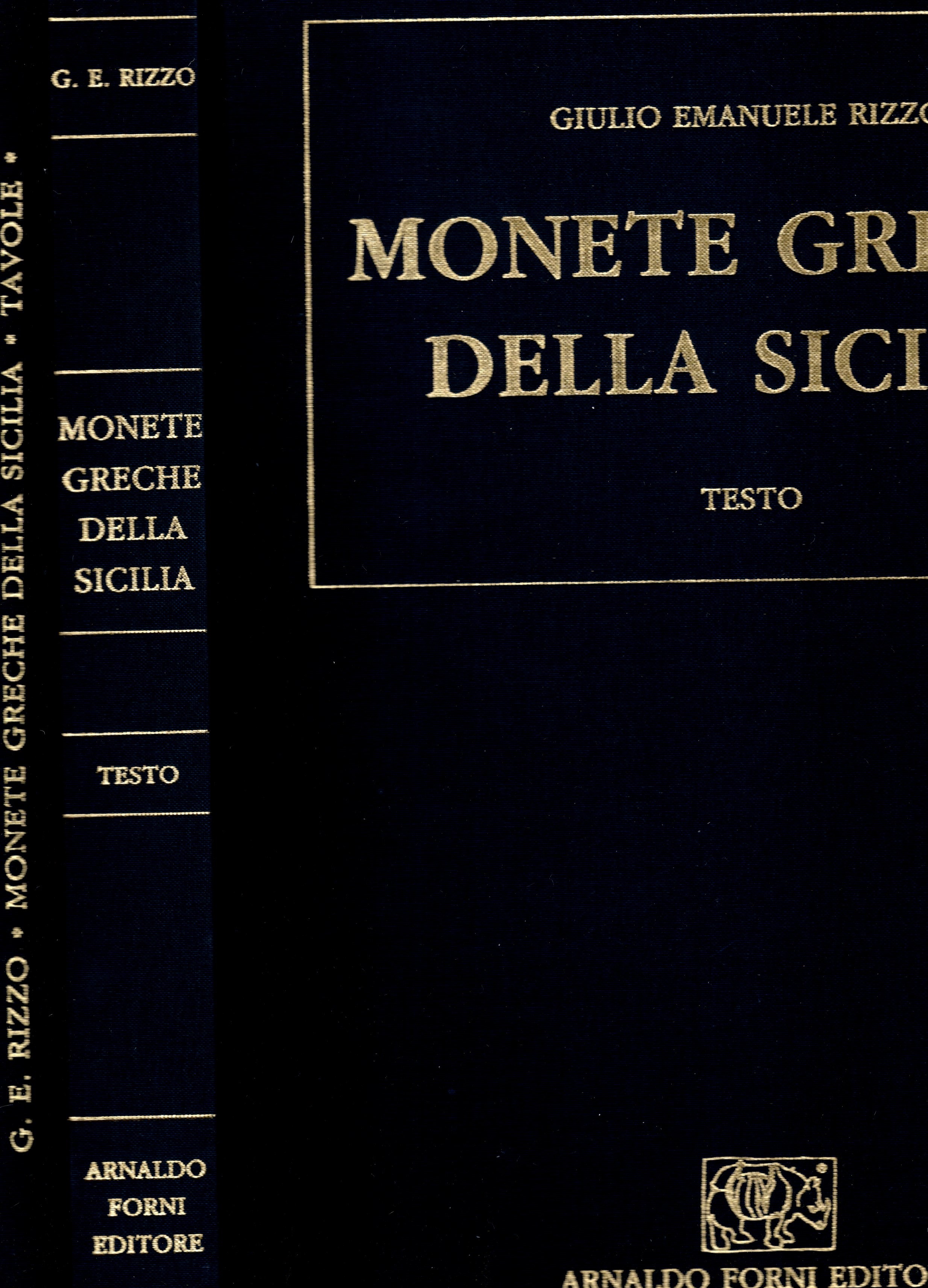 RIZZO Givlio Emanvele - Monete greche della Sicilia. Bologna, 1997. 2 vol. completo. Vol. testo, pp. vii, 318+1, ill. 98 + 3, tavv. 9 in lettere, Vol. di tavole, pp. xi, tavv. 66. Legatura ed. rigida in tutta tela con scritte, come nuovo in ottimo s