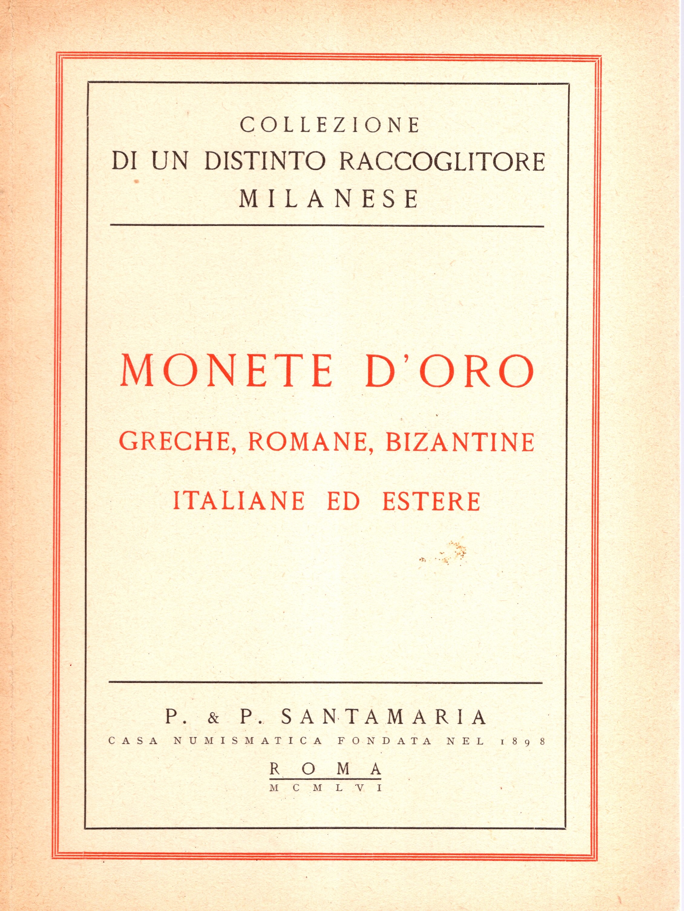 SANTAMARIA P. & P. - Roma, 6 – Giugno, 1956. Collezione di un distinto raccoglitore milanese. Monete d’oro greche, romane, bizantine italiane ed estere. Pp. 28, lots 293, plates 12. legatura ed. lista prezzi Valutazione,interno ottimo stato. Spring, 65