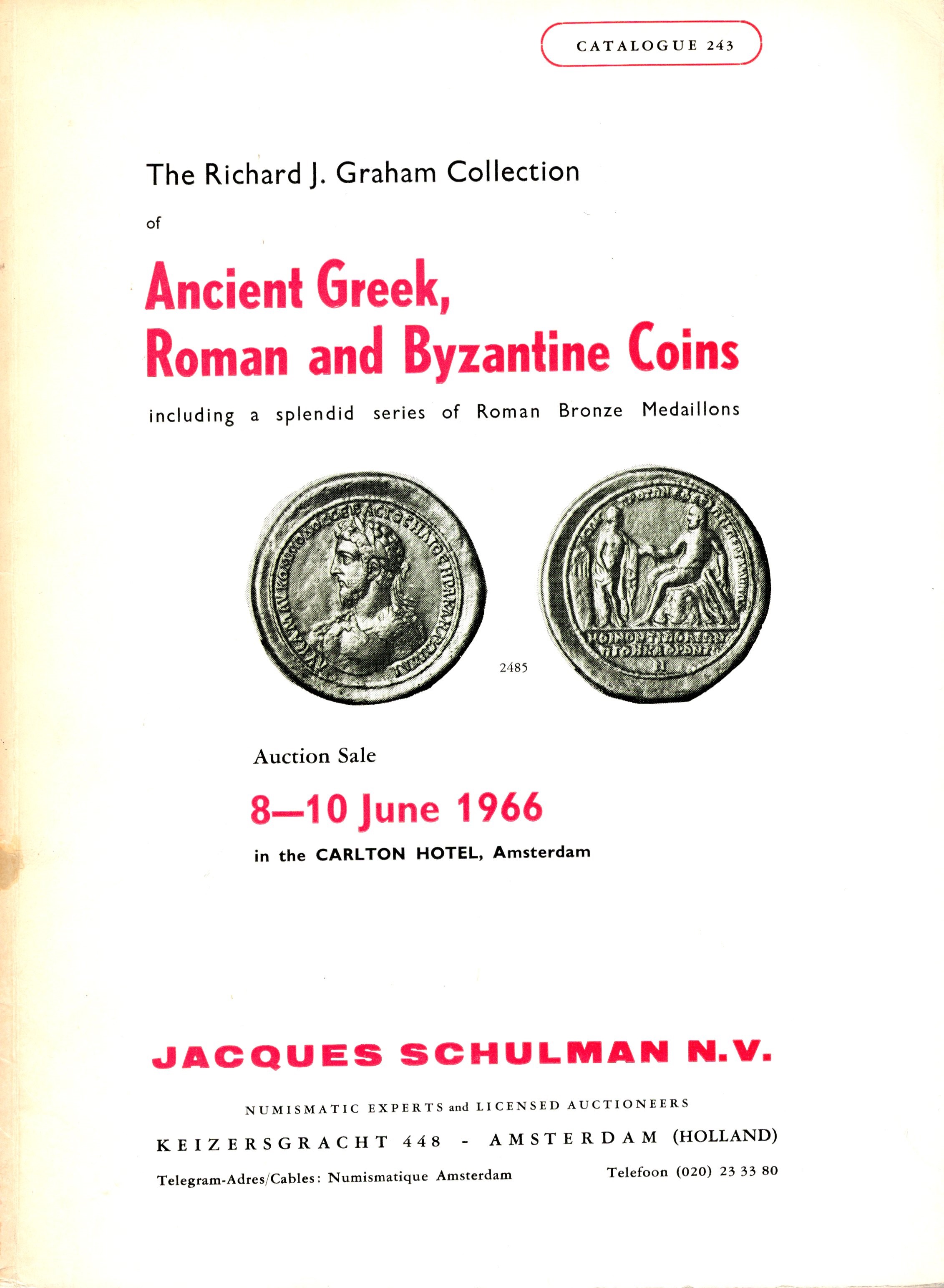 SCHULMAN Jacques - Amsterdam - 8\10 - June, 1966. The Richard J. Graham ( Paul Tinchant) pseudonym. Ancient Greek, Roman and Byzantine coins including a splendid series of roman bronze medaillon. pp 150, lots 1001 - 2541, plates 40. Legatura ed. buono sta