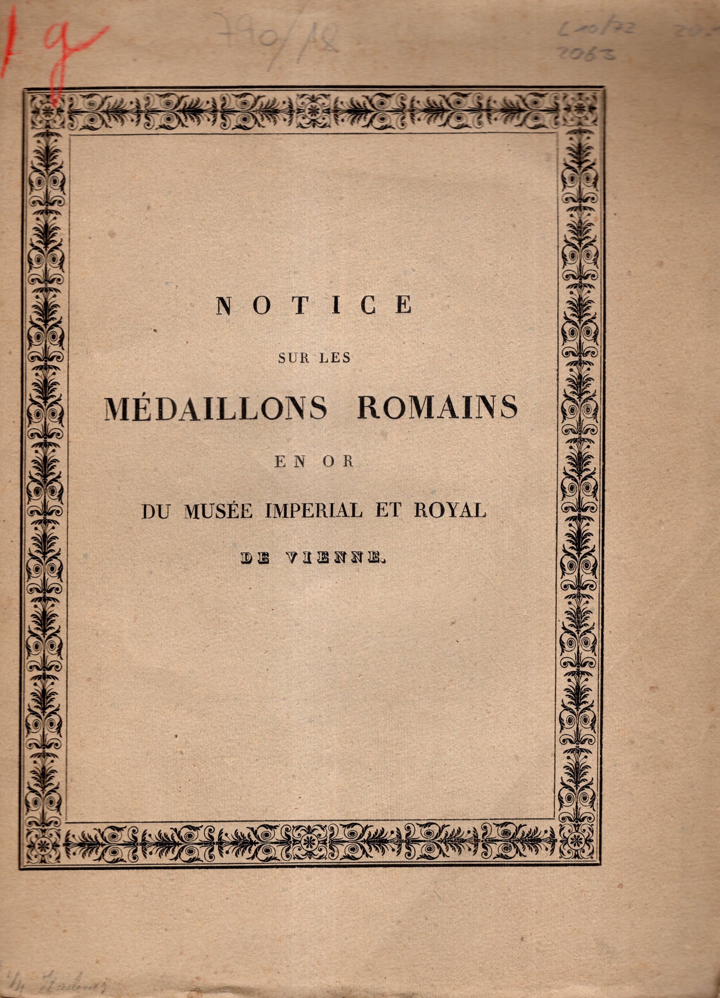 STEINBUCHEL Ant. - Notice sur les Medaillons romains en or du Musée Imperial et Royal de Vienne. Vienne, 1826. pp 30, plates 4. Brossura ed. sciupata, interno buono stato, molto raro.