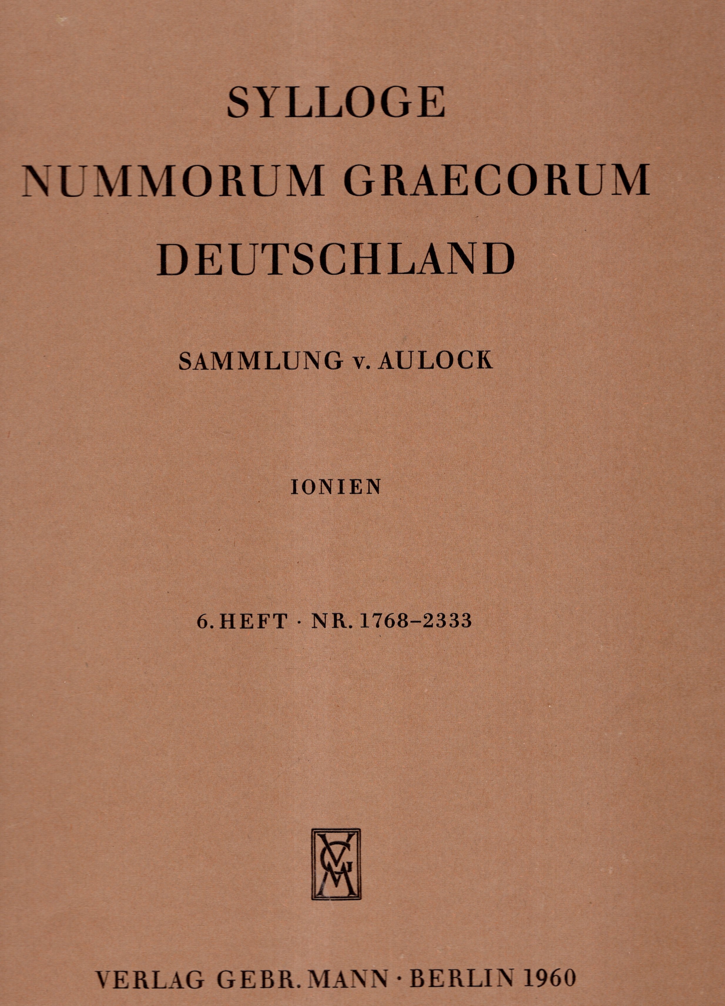 SYLLOGE NUMMORUM GRAECORUM. Deutschland. Sammlung V. Aulock. IONIEN. 6 heft 1768 – 2333. Berlin, 1960. pp. 3, pl. 55 - 72. Brossura ed. buono stato, important and rare. C.S. 1914