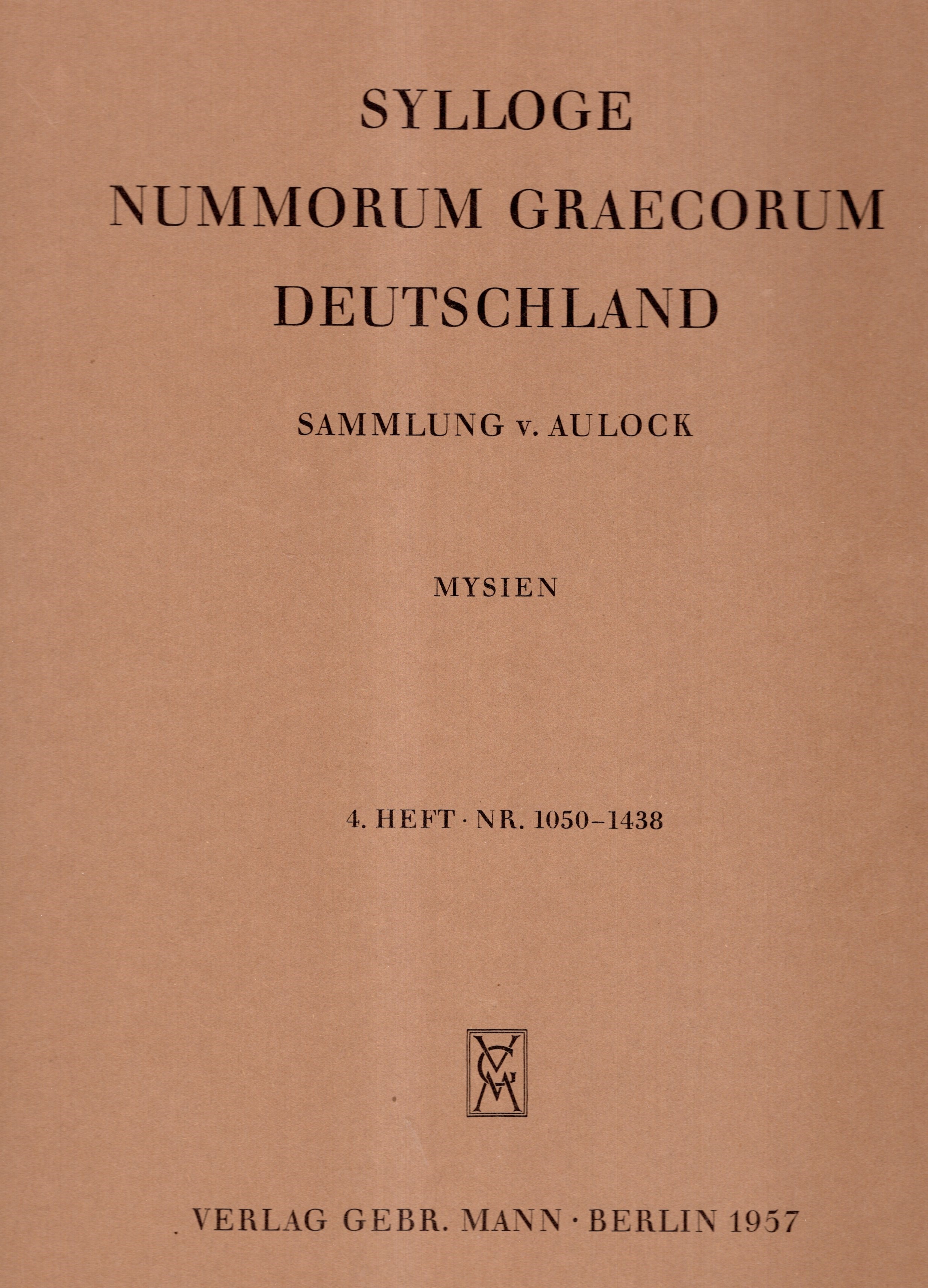 SYLLOGE NUMMORUM GRAECORUM. Deutschland. Sammlung V. Aulock. MYSIEN. 4 heft n. 1050 -1438. Berlin, 1957. pp. non numerate, lots 1050--1438, plates 33-44. Brossura ed. ottimo stato, importante. C.S. 1914