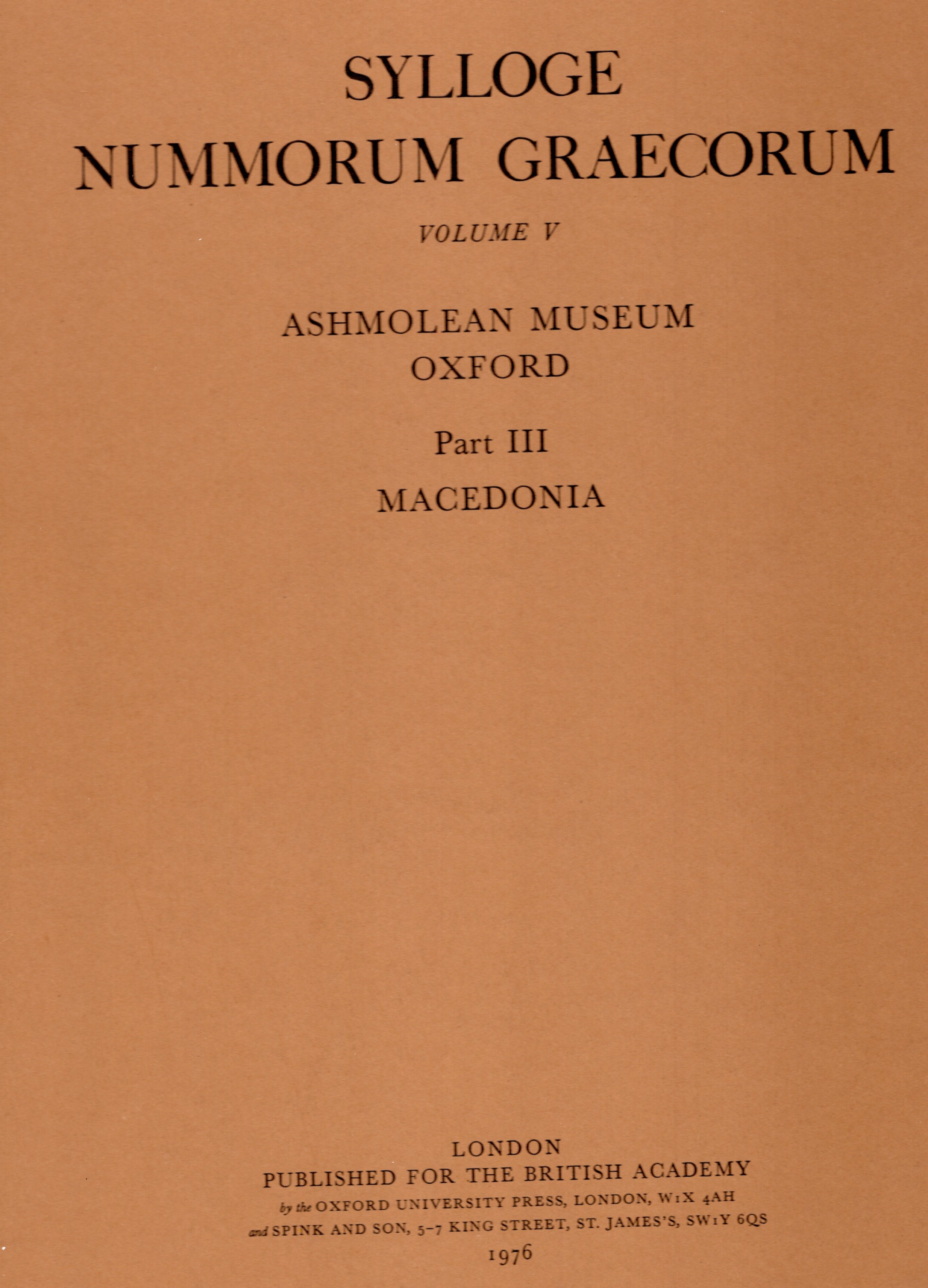 SYLLOGE NUMMORUM GRAECORUM. Vol. V. Ashmolean Museum Oxford. London, 1976. Part III. Macedonia. tavv. 41 – 68. Rilegatura editoriale, ottimo stato.