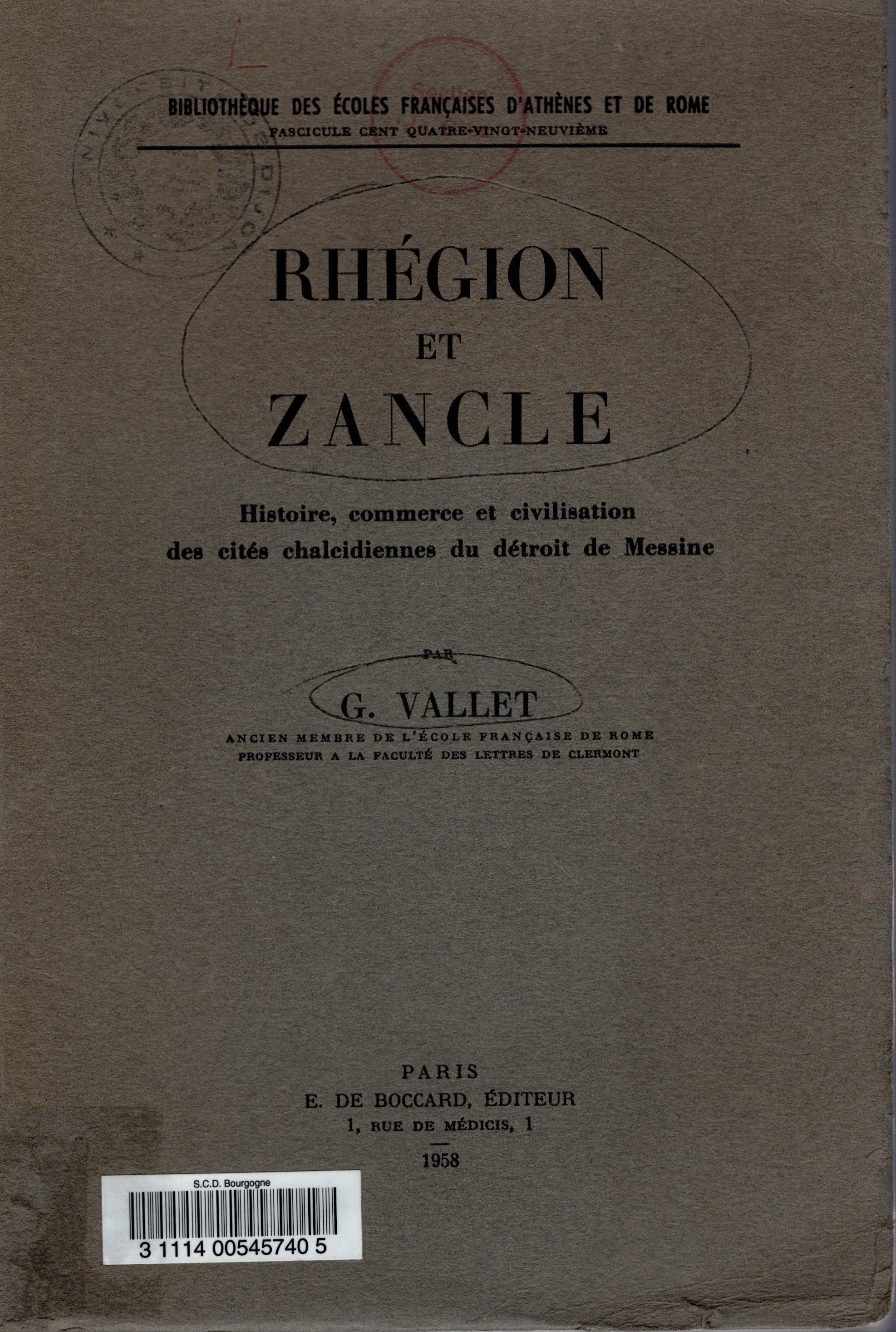 VALLET G. - RHEGION et ZANCLE. Histoire, commerce et civilisation des cités chalcidiennes du detroit de Messine. Paris, 1958. pp.407, plates. 20. ril ed worn, inside in excellent condition, important and rare work still today a point of reference for the