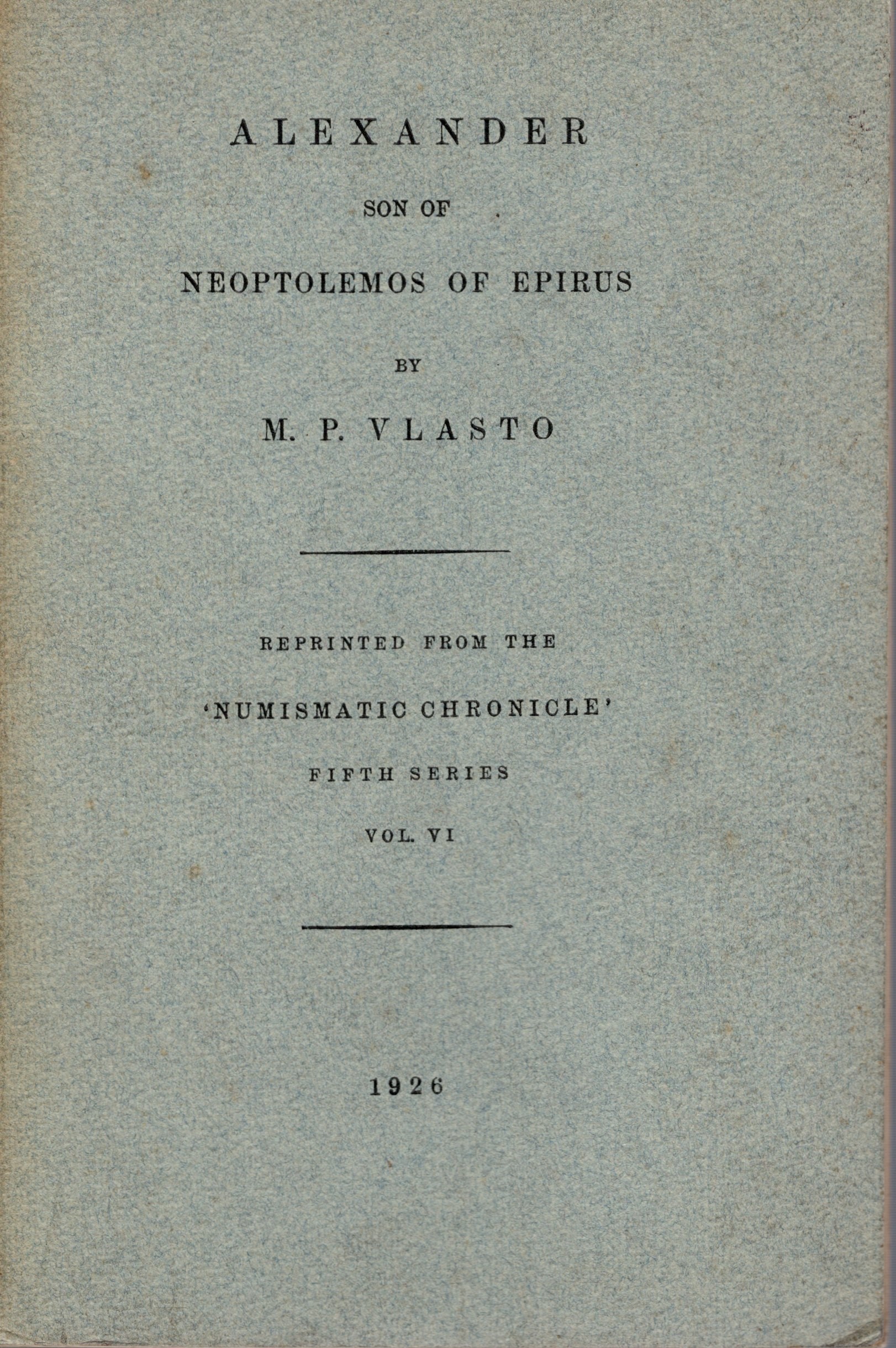 VLASTO M. P. - Alexander son of Neoptolemos of Epirus. London, 1926. pp. 79, pl. 3. rill and worn, inside in very good condition. very rare and sought after, still used today as a reference text. Clain-Stefanelli 2460