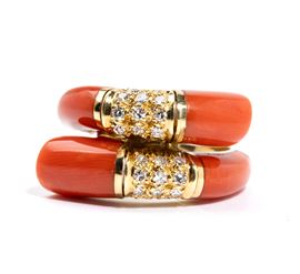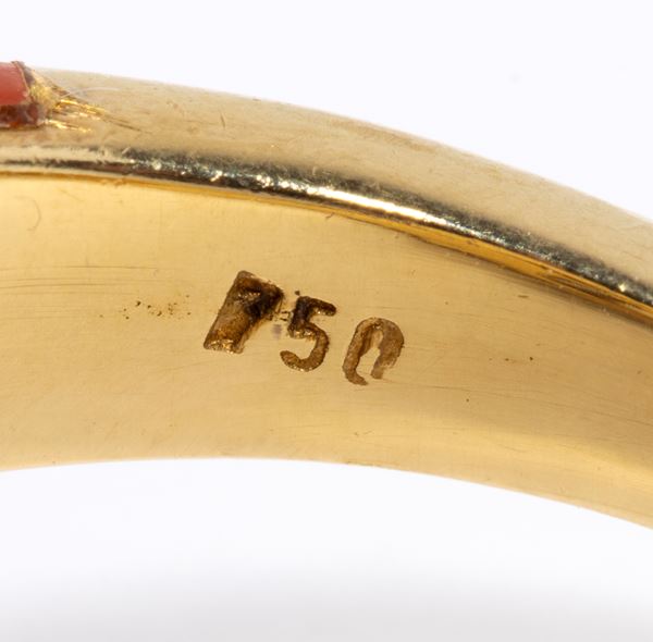 in oro giallo 18k, impreziosito da tre file di diamanti di forma rotonda, taglio brillante, circa 0.30 ct, e corallo rosso del Mediterraneo (Corallum Rubrum).