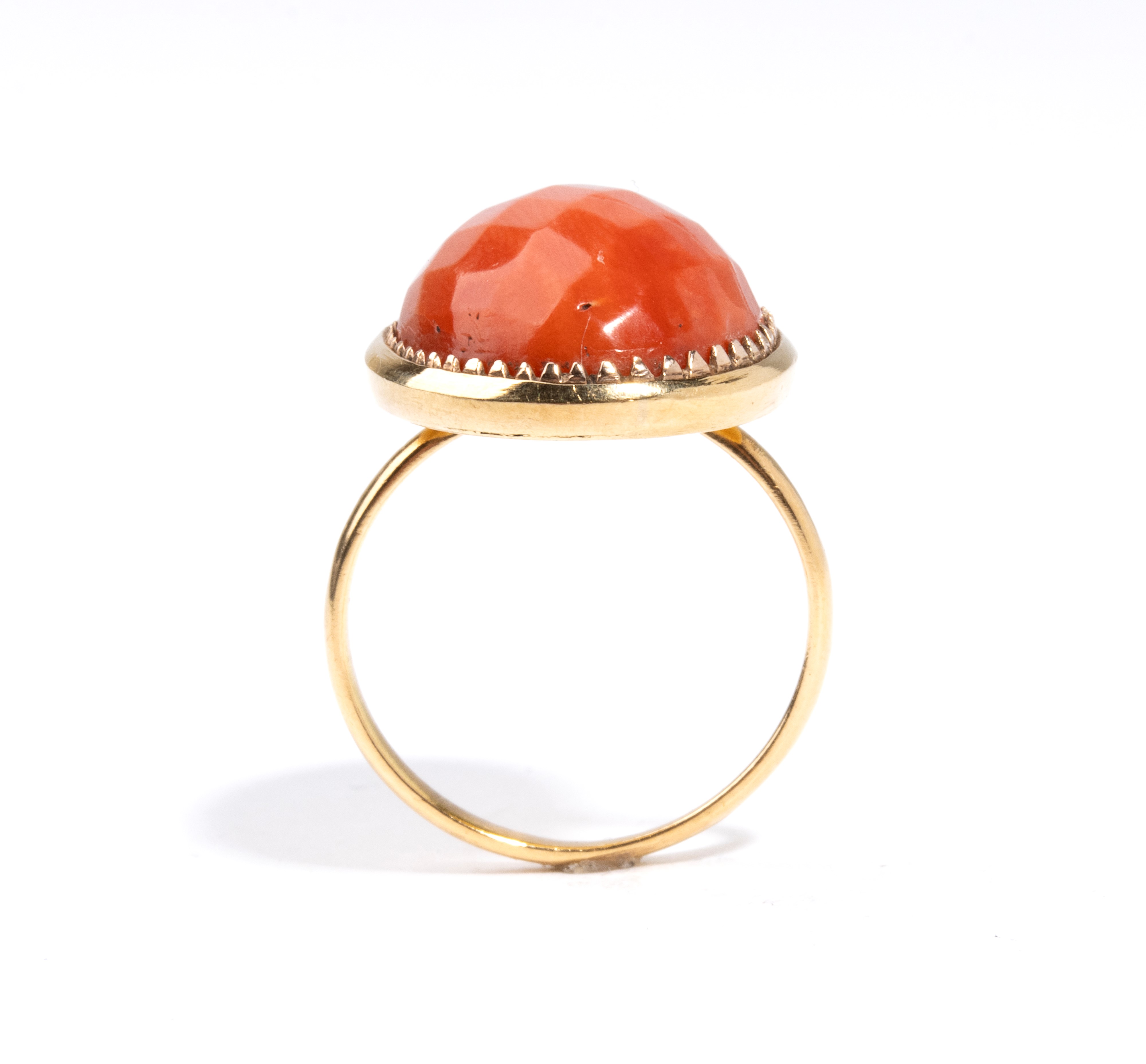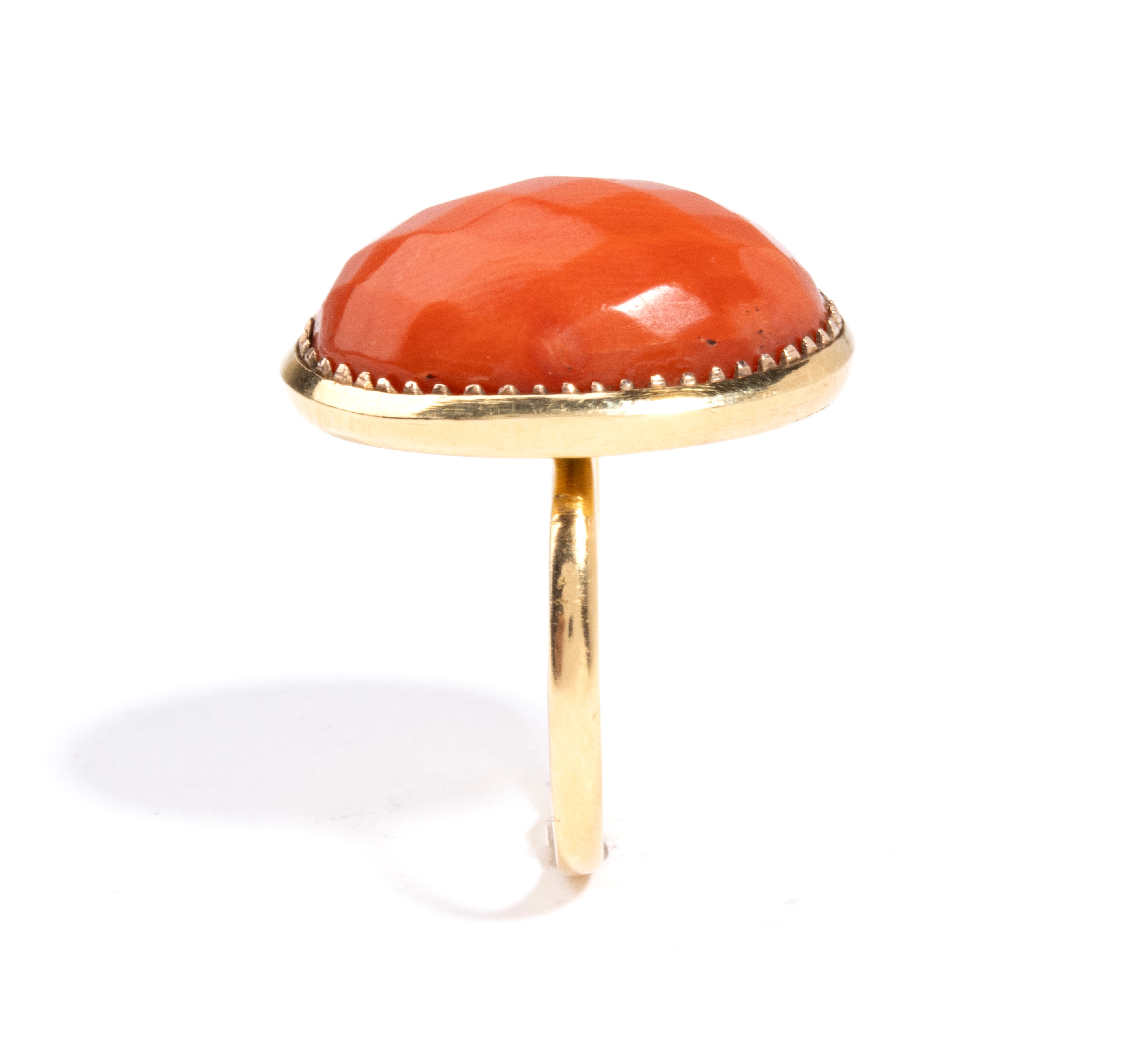 in oro giallo, incastonato con cabochon sfaccettato di corallo rosso del Mediterraneo (Corallum Rubrum).
