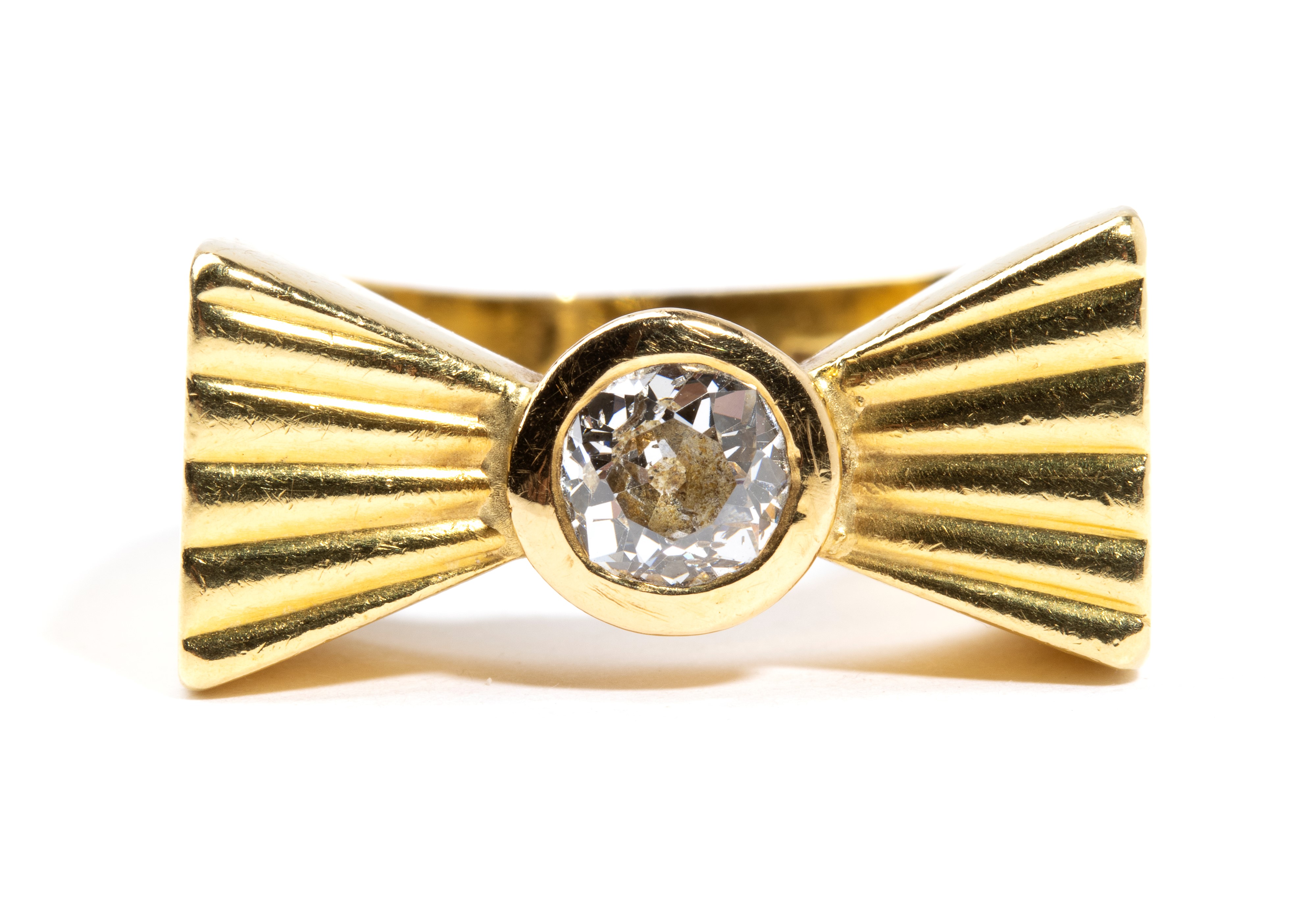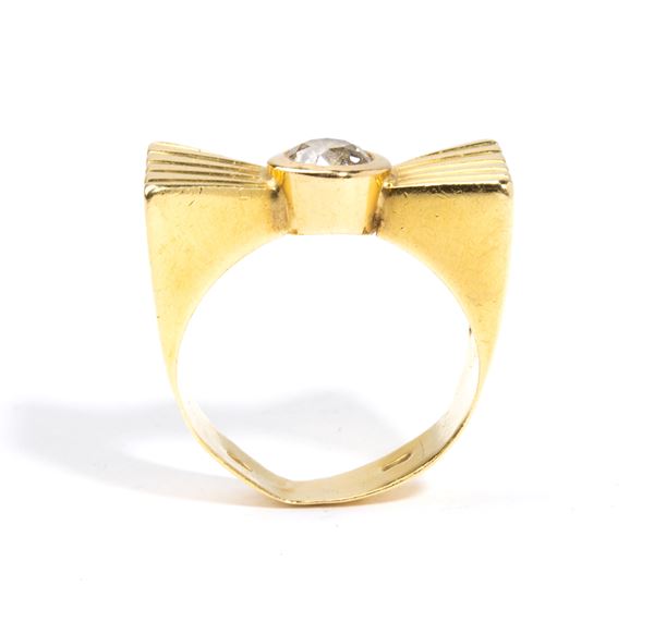 in oro giallo 18k, a forma di fiocco, incastonato con n. 01 diamante di forma rotonda, taglio vecchio, stimato per un peso di circa 0.50 ct, colore J-K, purezza I, come misurato con montatura.