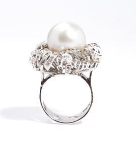 a forma di fiore, in oro bianco 14k, con perla Australiana centrale contornata da diamanti di forma rotonda, taglio brillante, stimati per un peso totale di circa 1.20 ct, colore H-I, purezza VS-SI, come misurati e classificati nella montatura. .