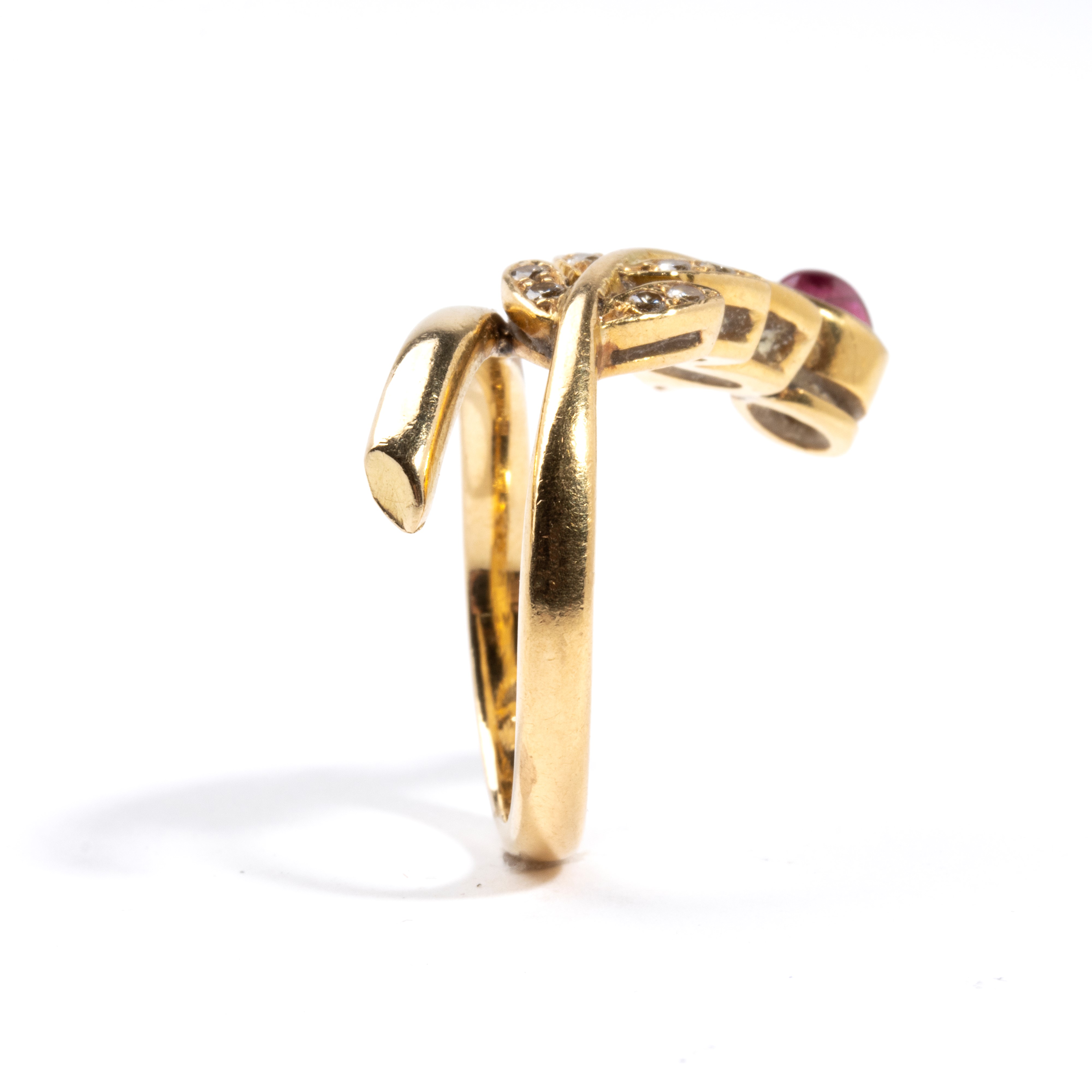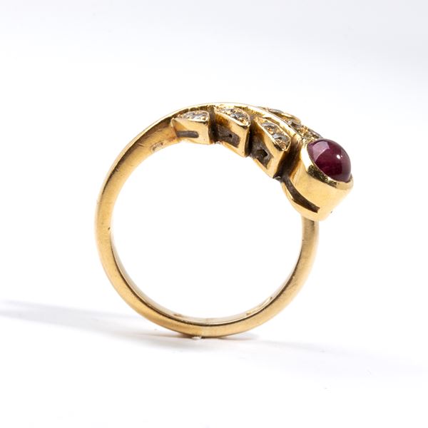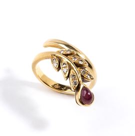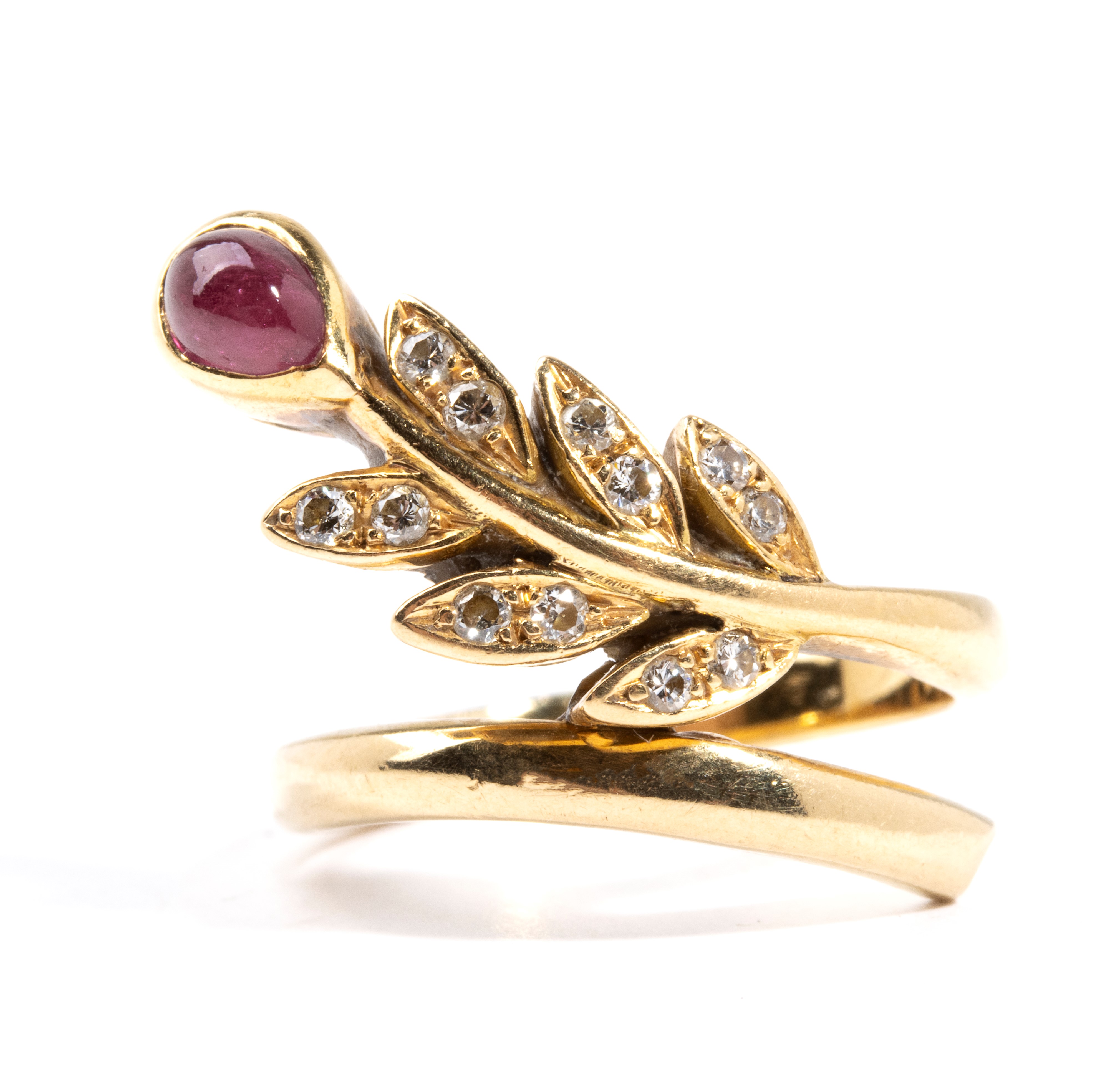in oro giallo 18k, con motivo di foglie impreziosite da n. 12 diamanti di forma rotonda, taglio brillante, circa 0.15 ct, e n. 01 rubinio forma ovale, taglio cabochon.