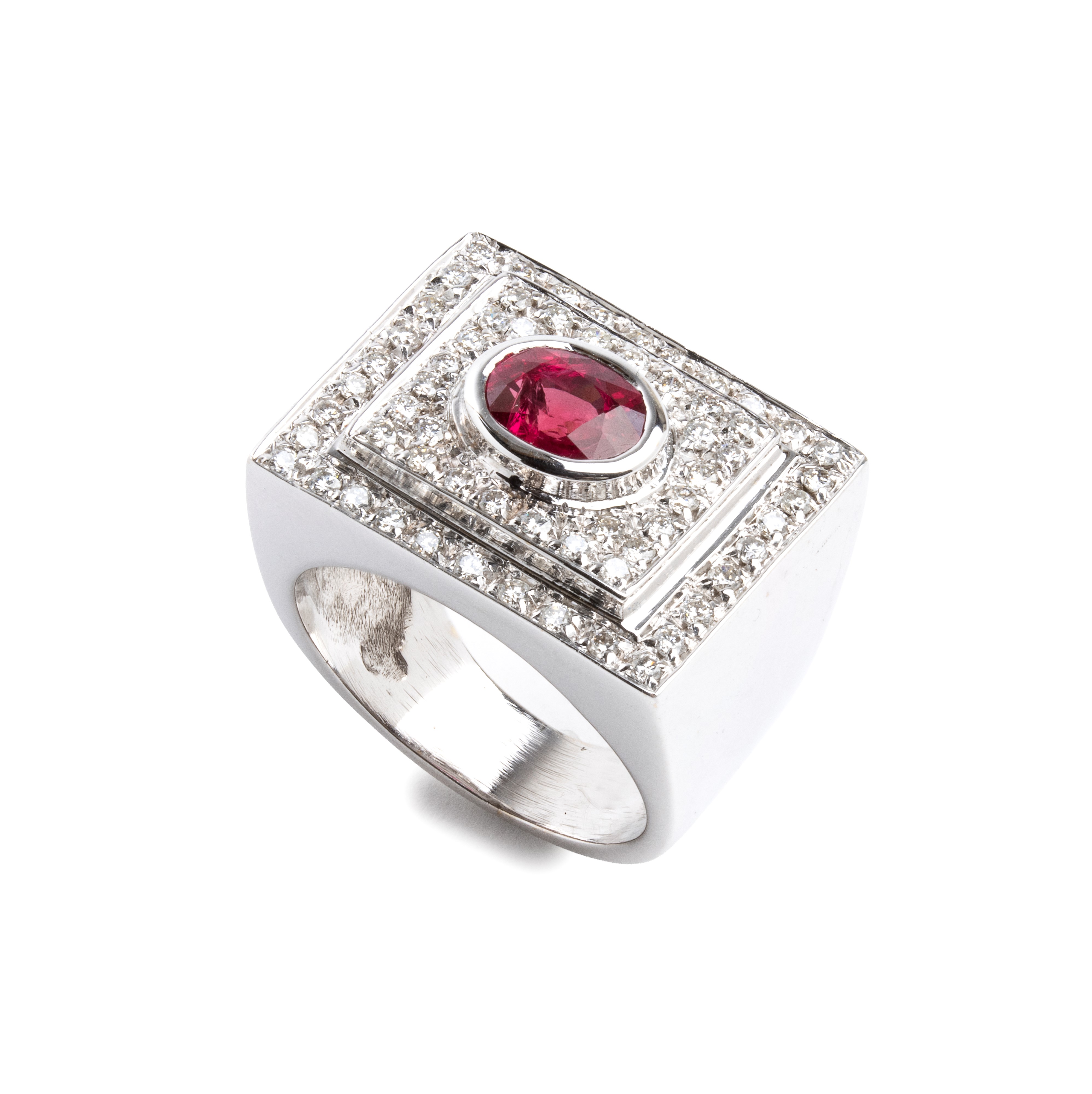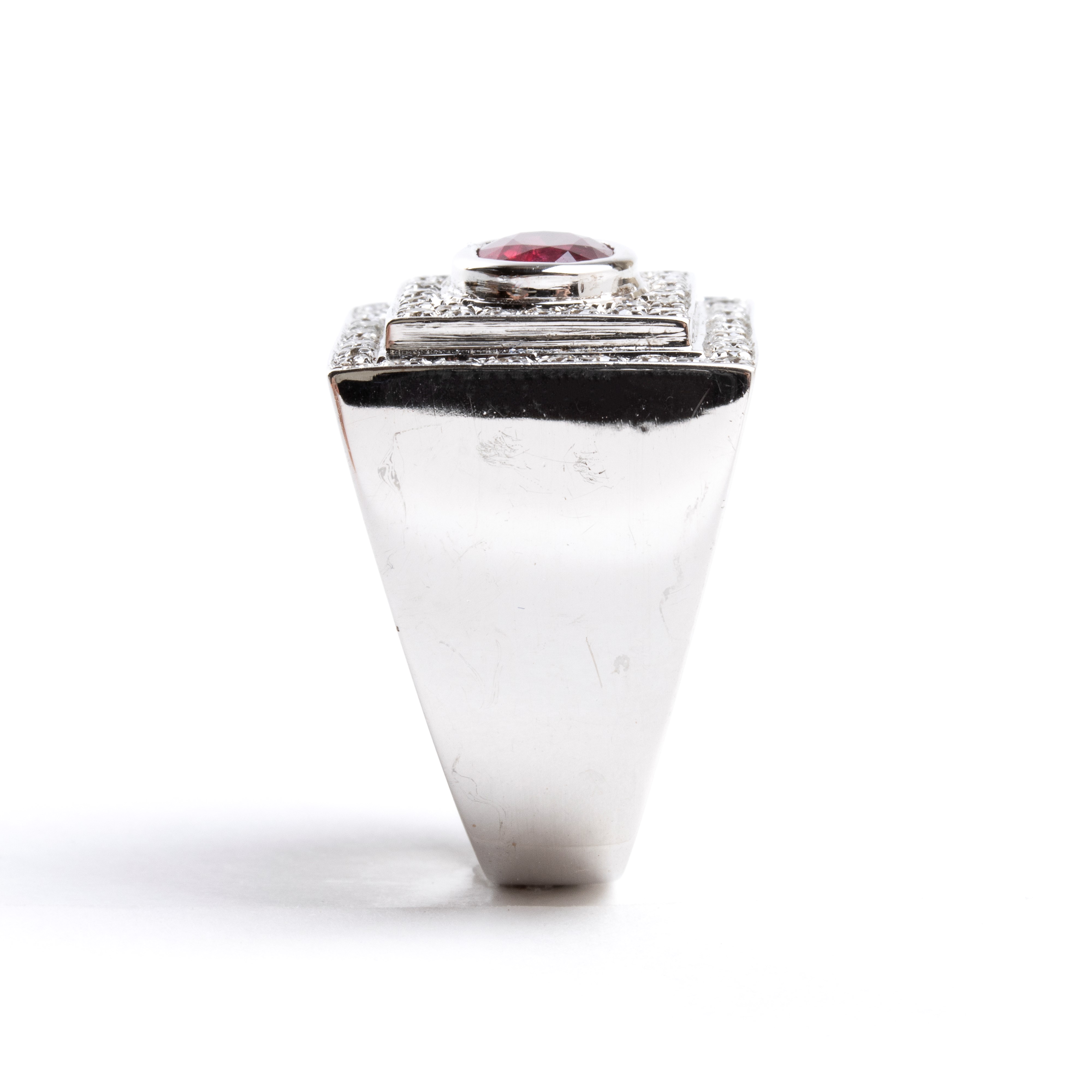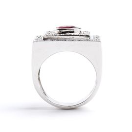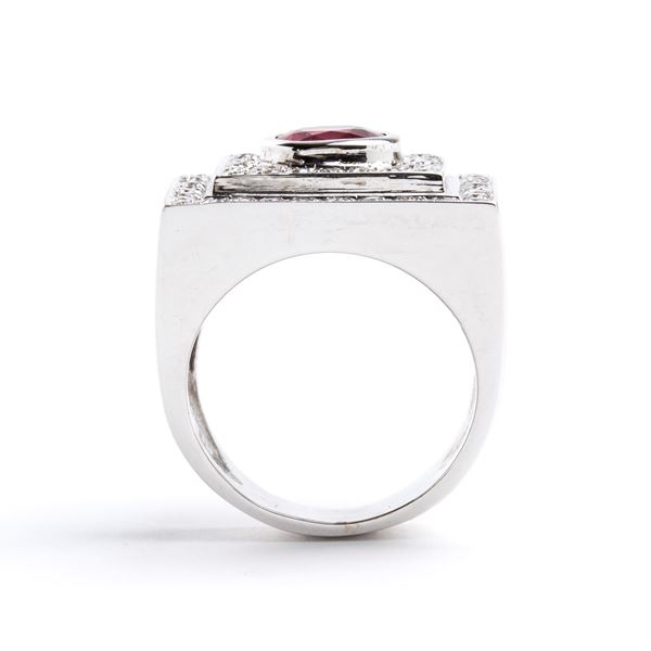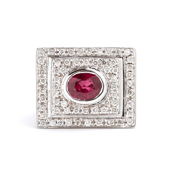 in oro bianco 18k, incastonato con rubino, contornato da diamanti.