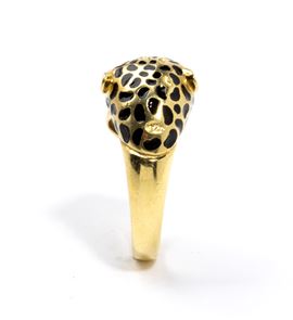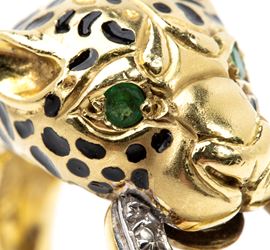 a forma di testa di leopardo che si morde la coda, in oro giallo ed oro bianco 18k, decorato con smalti, diamanti e smeraldi.