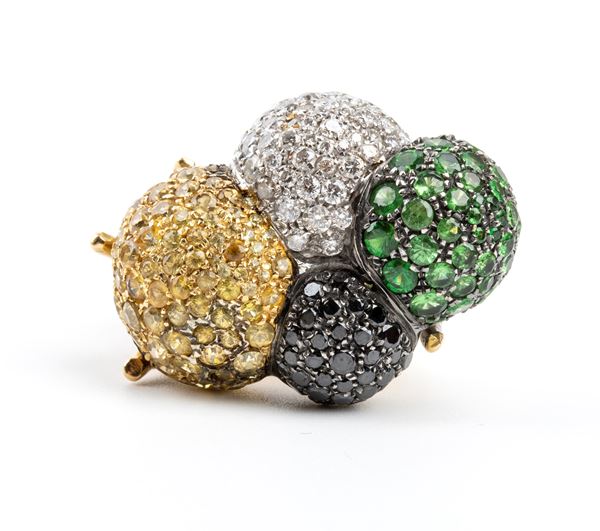 in oro 18k, parte superiore con motivo di quattro sfere incastonate rispettivamente con pavé di peridoti, diamanti neri, quarzi citrini, diamanti taglio brillante stimati per un peso totale di circa 2.00 ct.