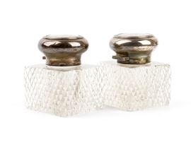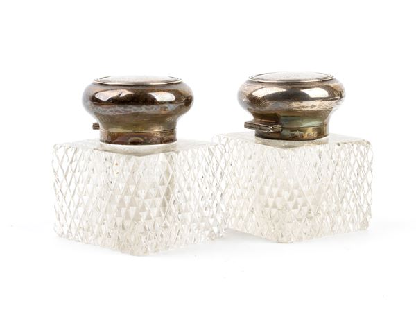 di forma rettangolare poggiante su piedini sferici con du flaconi in vetro molato.