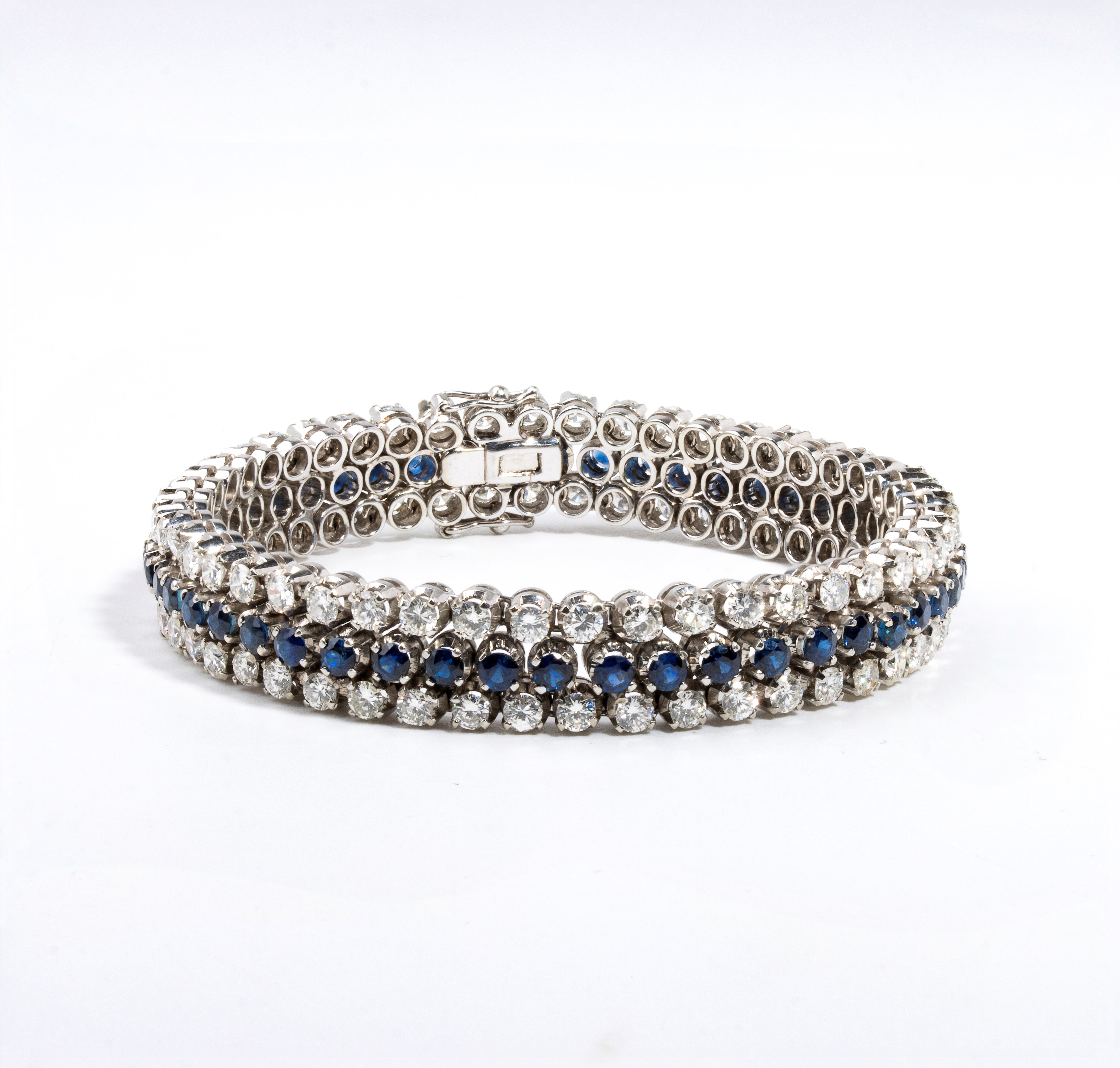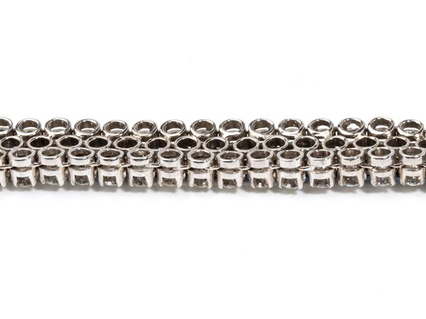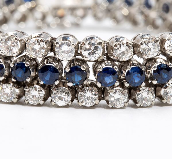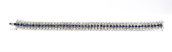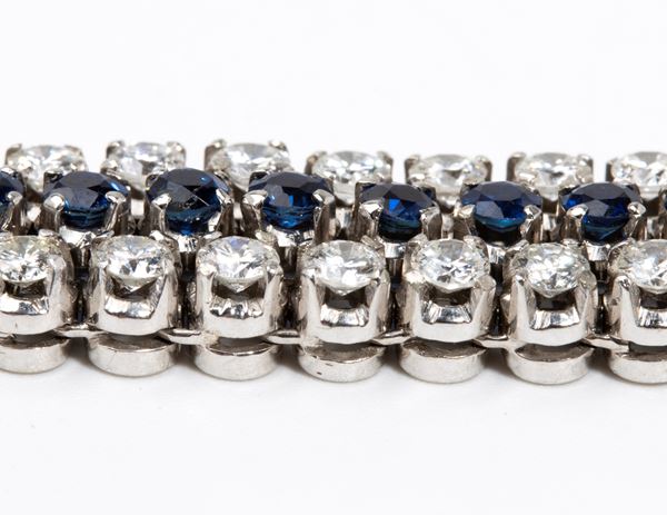 in oro bianco 18k, impreziosito da due file di diamanti stimati per un peso di 7.00, colore F-G, purezza VVS-VS ed una fila centrale di zaffiri stimati per un peso di circa 3.50 ct.