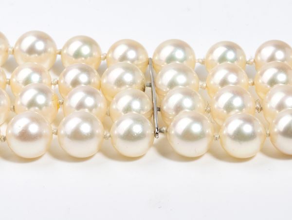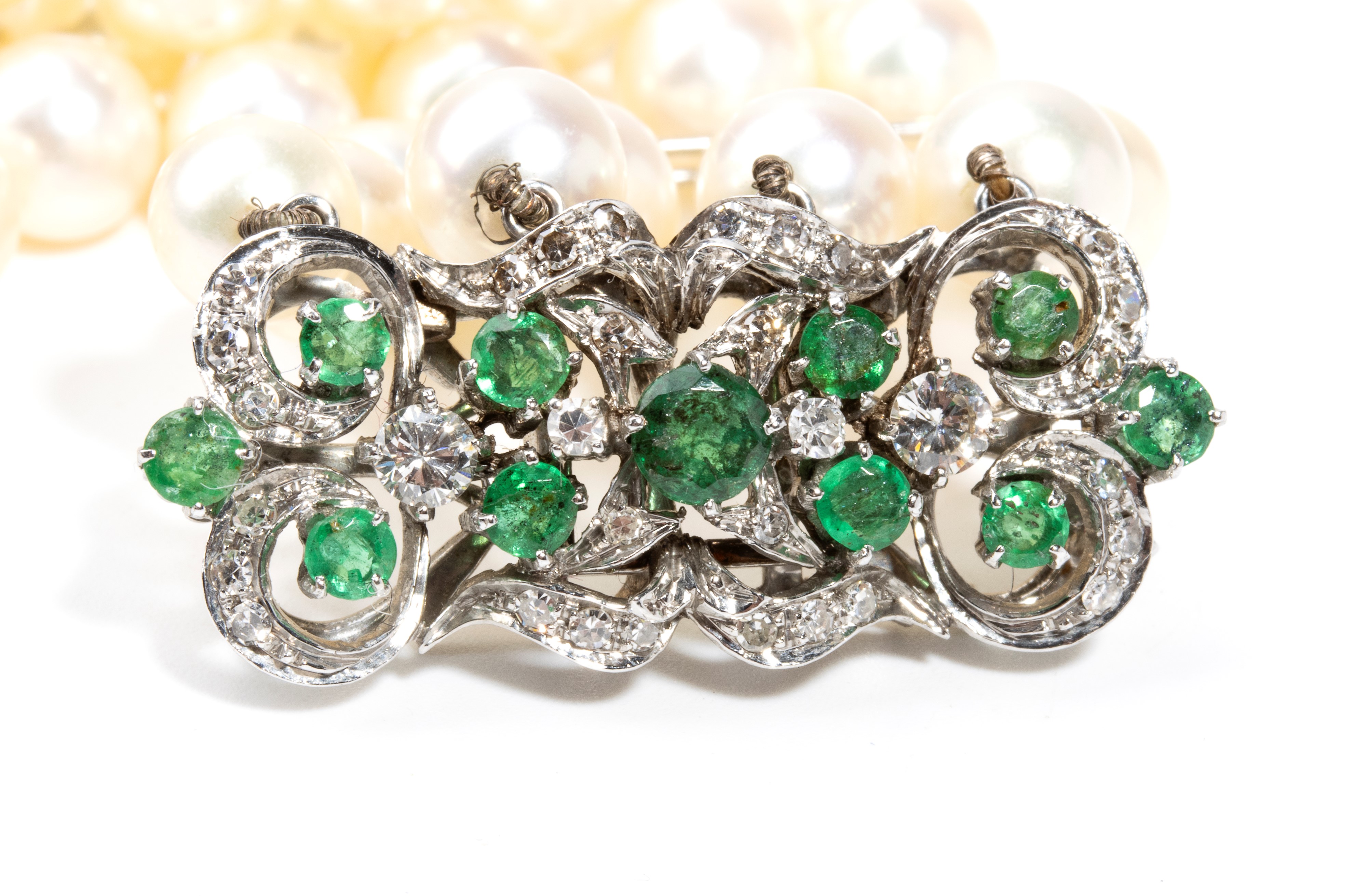 a quattro fili di perle coltivate d'acqua salata, fermezza in oro bianco a motivi floreali in smeraldi di forma rotonda, taglio composito, stimati per un peso totale dicirca 1.60 ct, e diamanti di forma rotonda, taglio huit-huit e taglio brillante, stimati per un peso totale di 0.50 ct, come misurati con montatura.