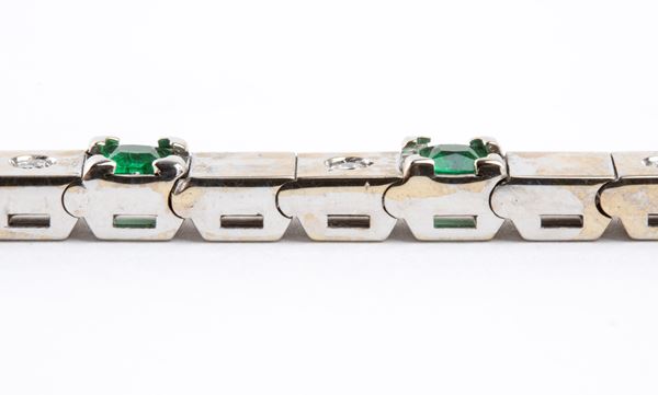 N. 15 diamanti di forma rotonda, taglio brillante, stimati per un peso totale di circa 0.18 ct, colore F-G, purezza VVS-VS, e n. 15 smeraldi di forma quadrata, taglio francese, per un peso totale di circa 1.00 ct, come misurati con montatura.