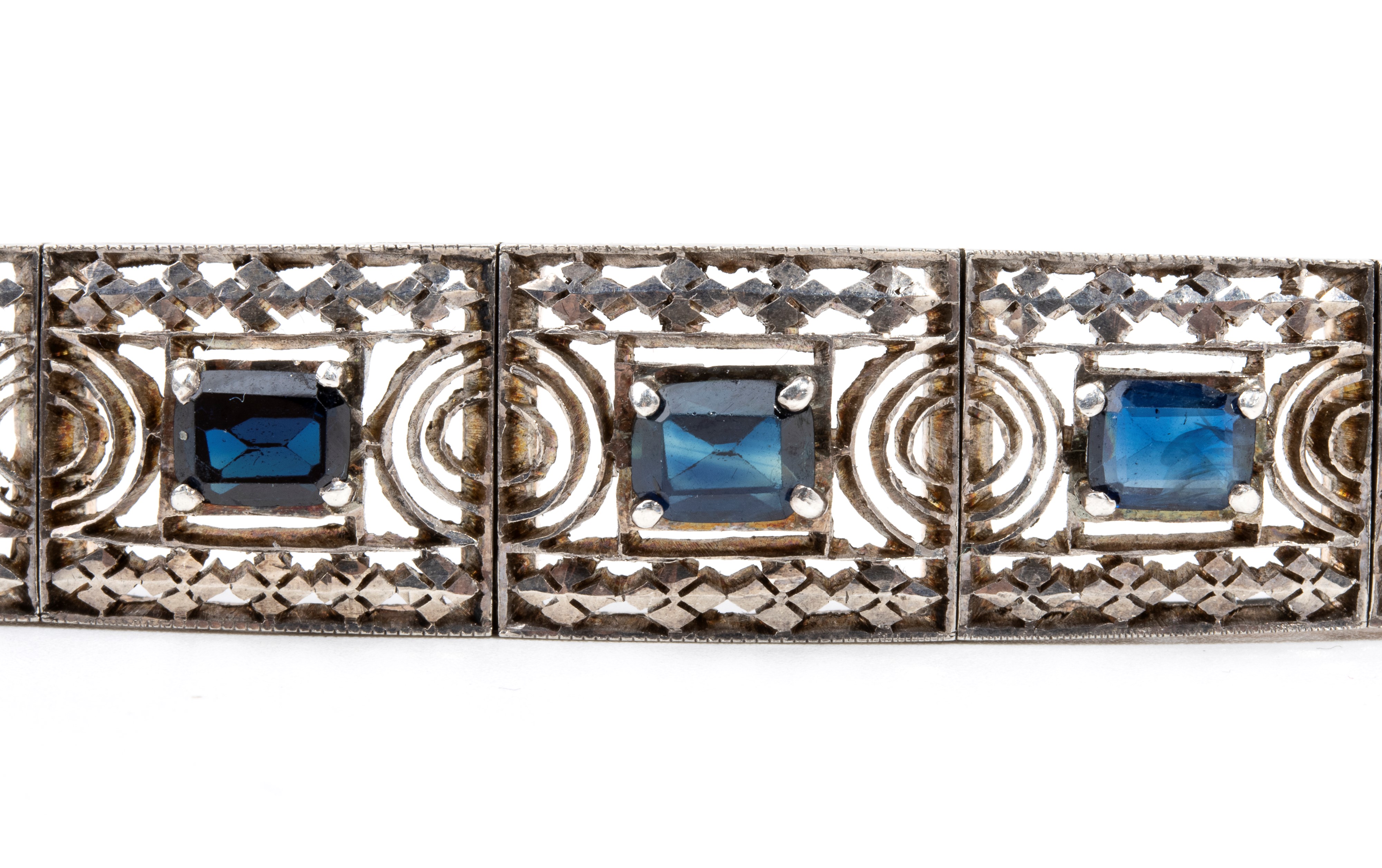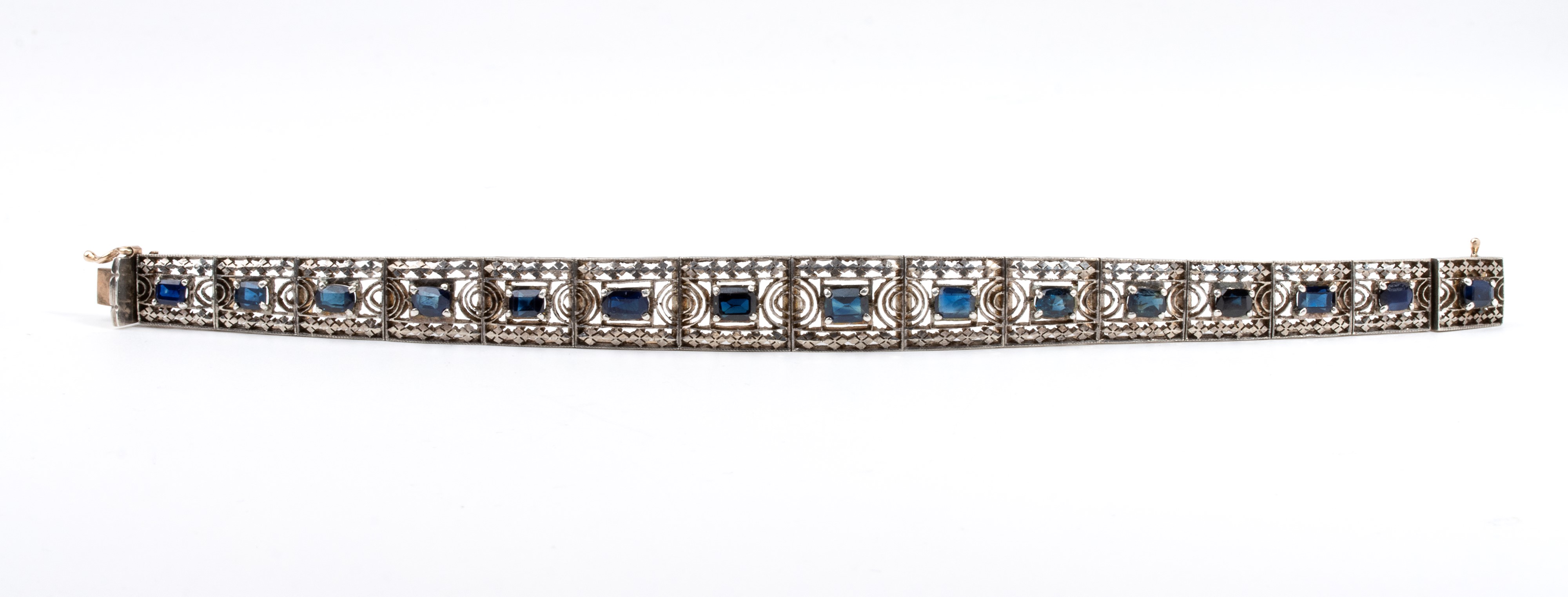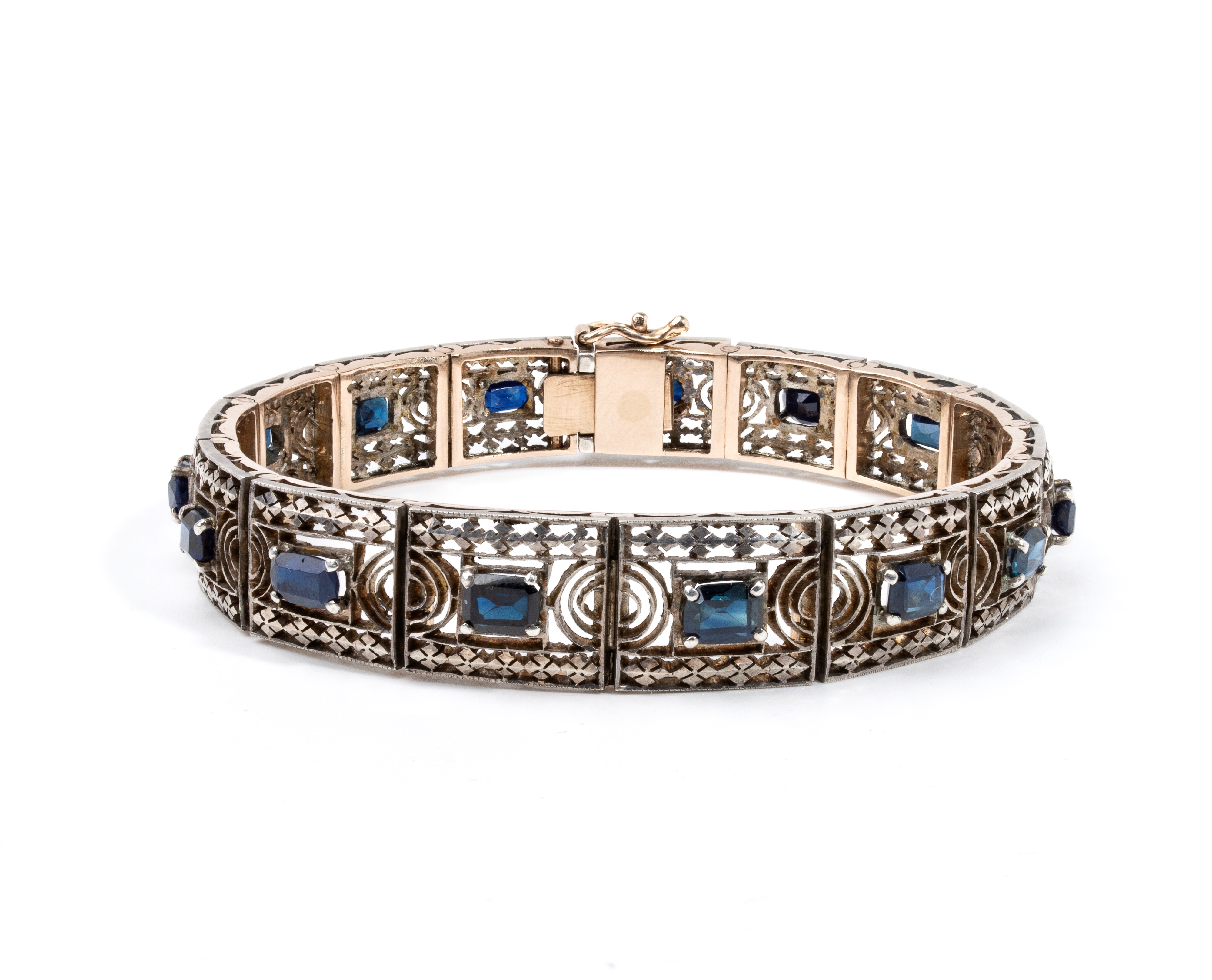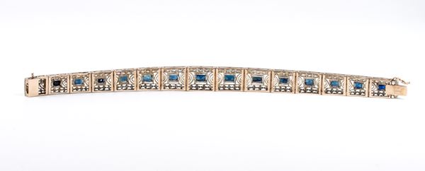 in oro e argento, lavorato a traforo con motivi geometrici, impreziosito da n. 15 zaffiri di forma rettangolare, taglio composito.