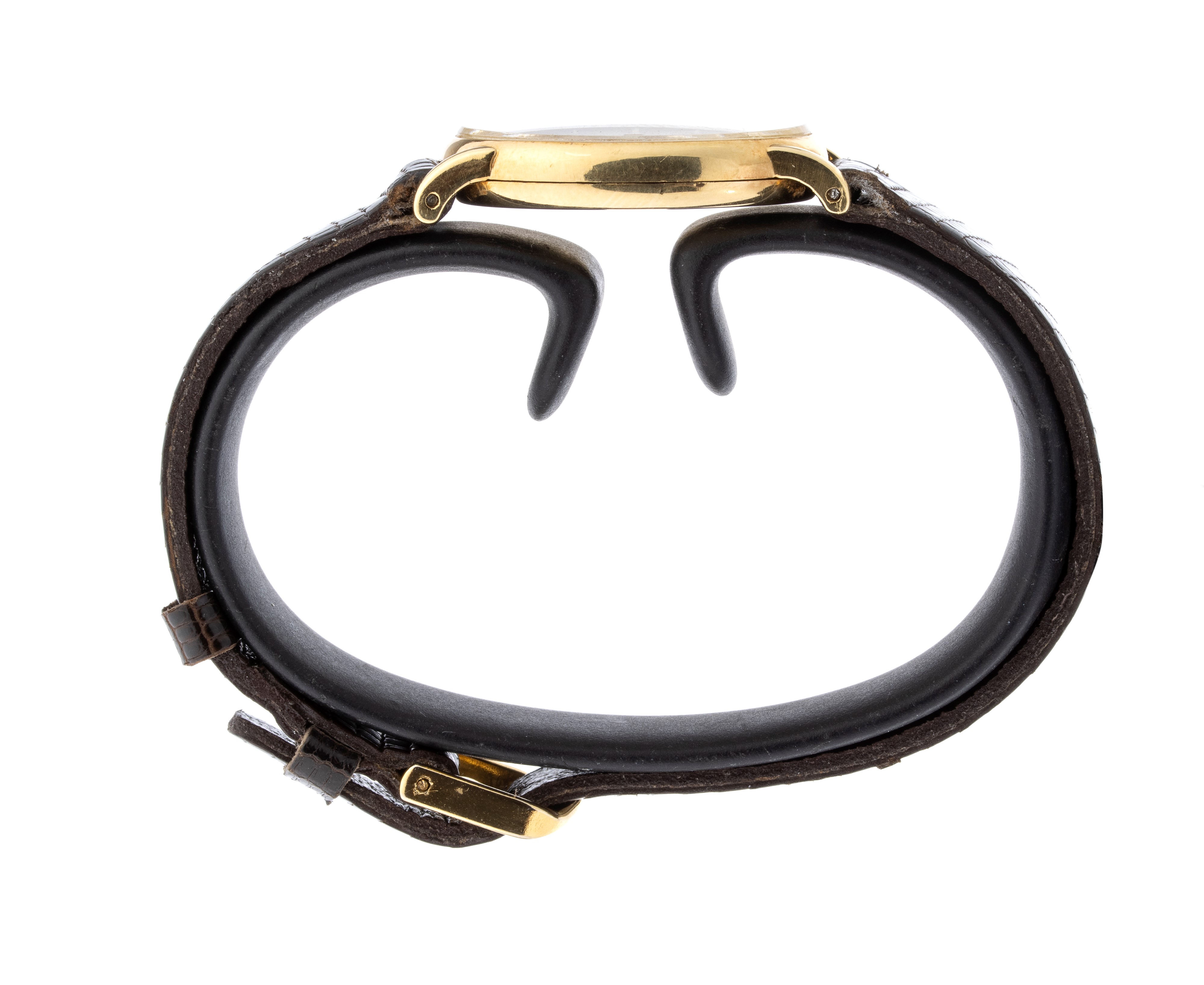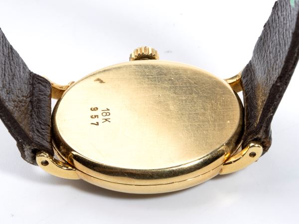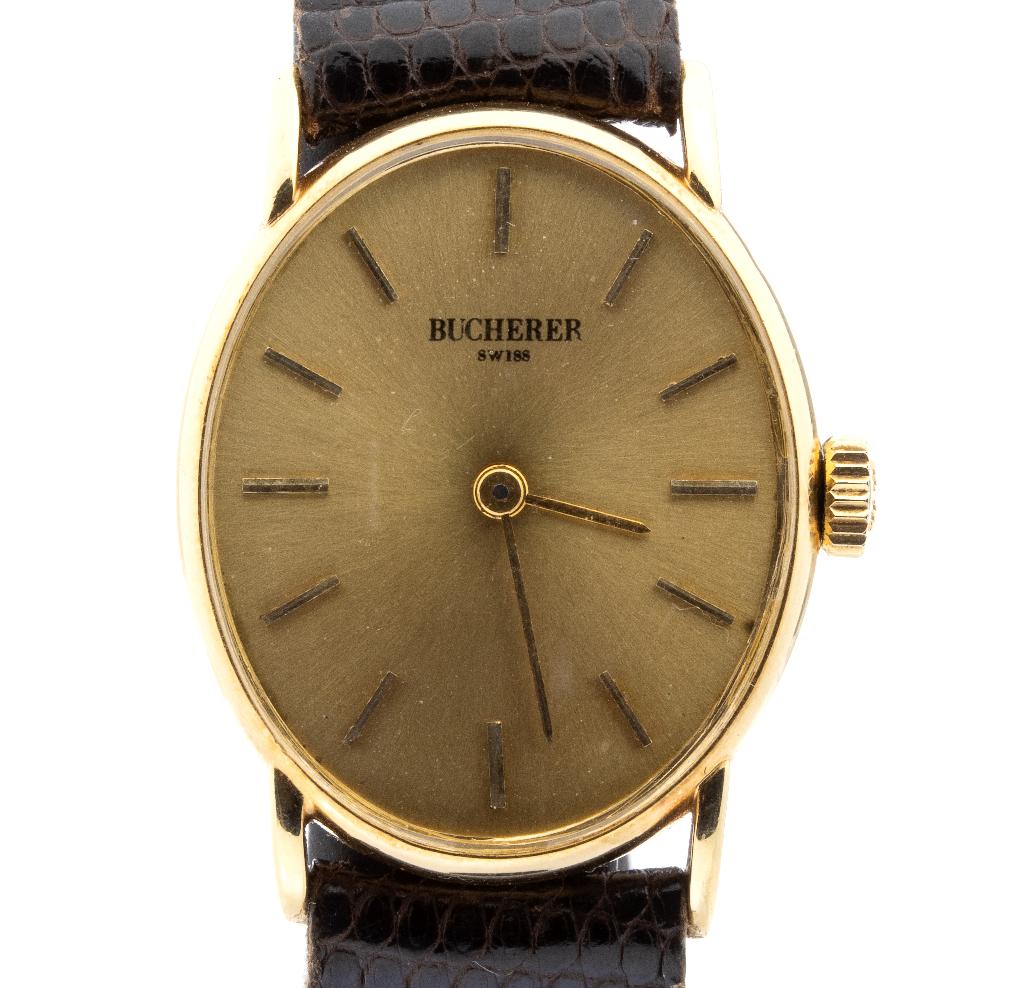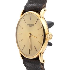 con cassa ovale in oro e quadrante champagne. Movimento meccanico a carica manuale marcato Bucherer. Cinturino in pelle con fibbia in metallo dorato e corona di carica Zenith non pertinente. Referenza 2512, riferimento fondello esterno 957.