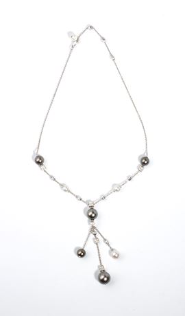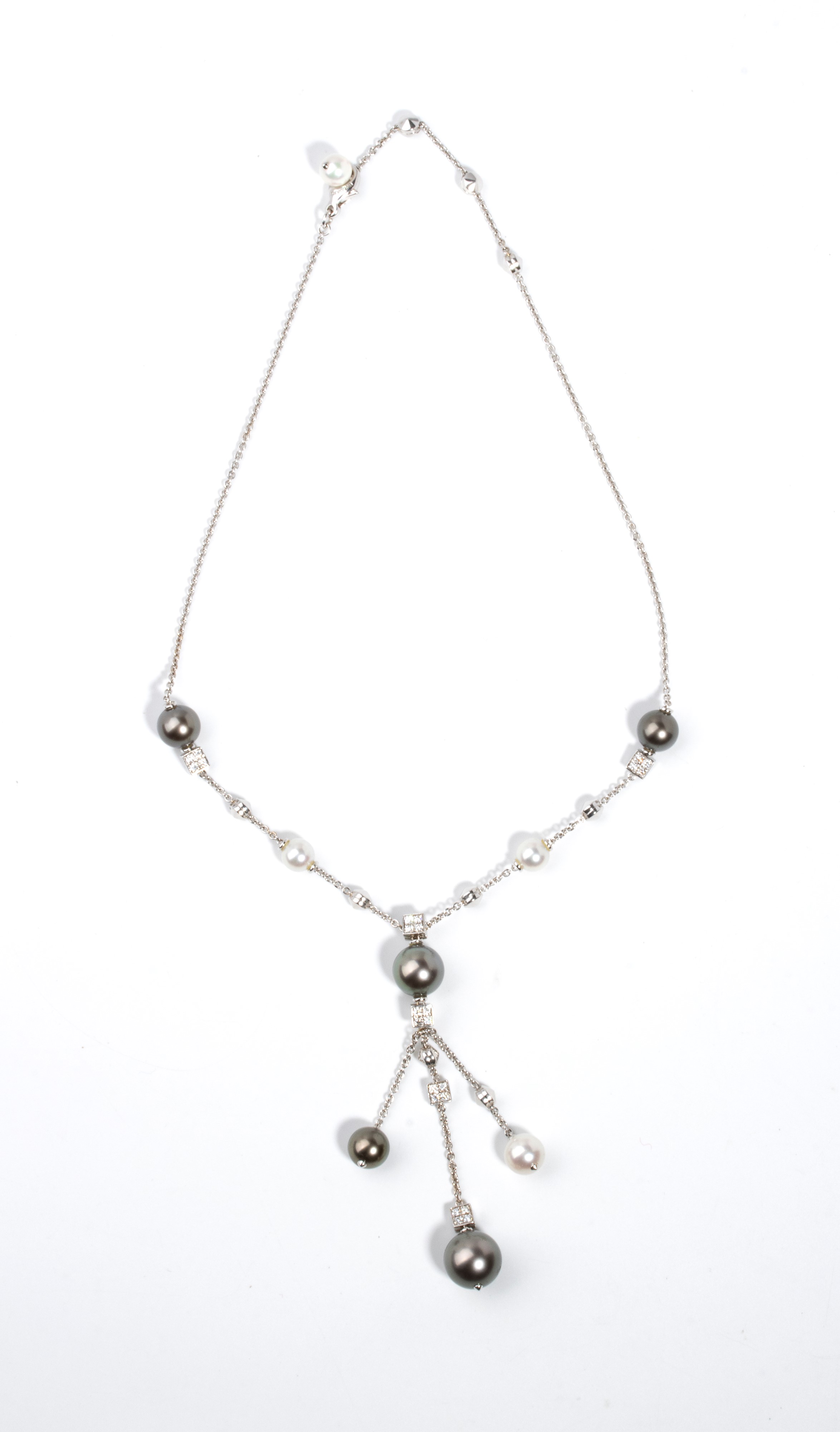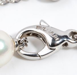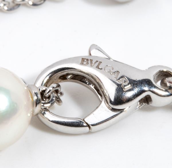 girocollo con frangia a maglie in oro bianco 18k, composto di un'alternanza di elementi geometrici in diamanti e perle coltivate d'acqua salata. Firmato "BVLGARI"
