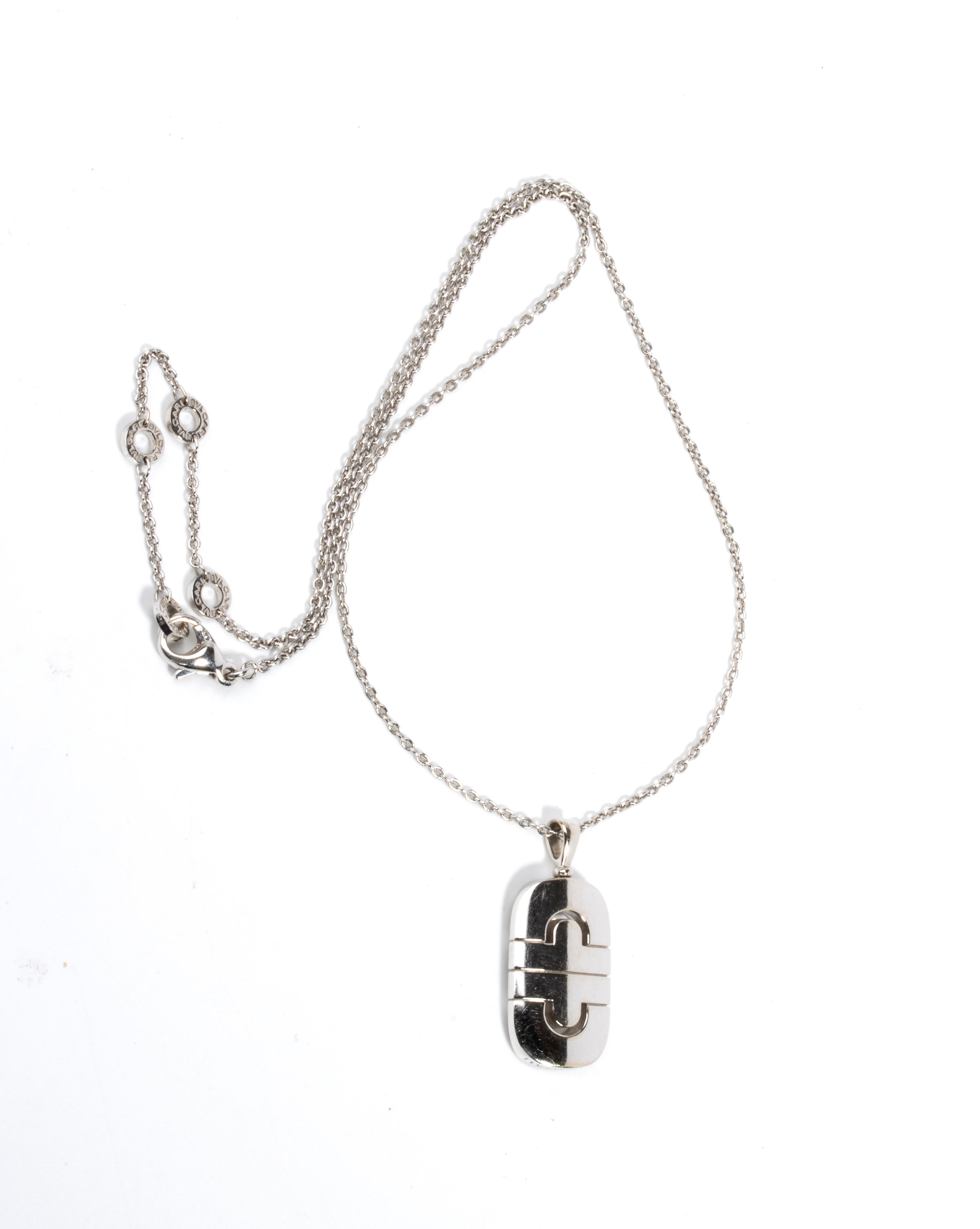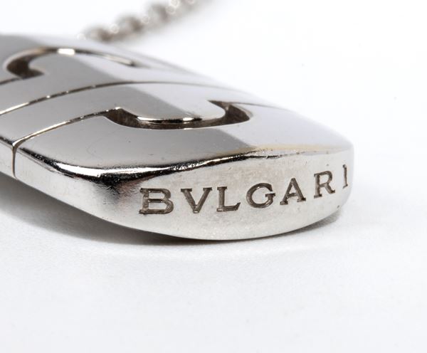 Punzonata "750 - MADE IN ITALY - BULGARI". Lunghezza catena: 51 cm. Lunghezza pendente: 3,2 cm. Peso: 16 gr.