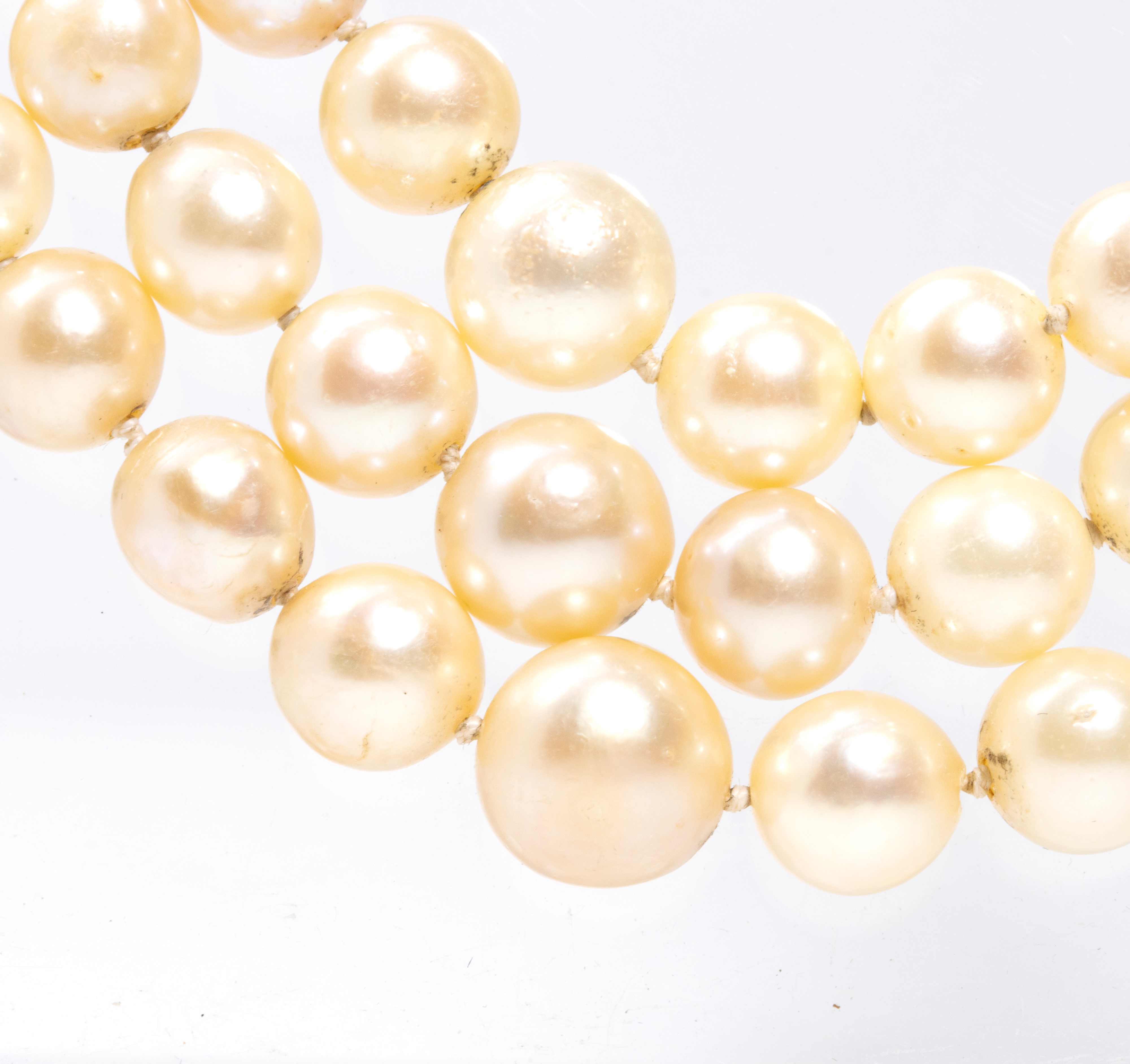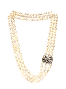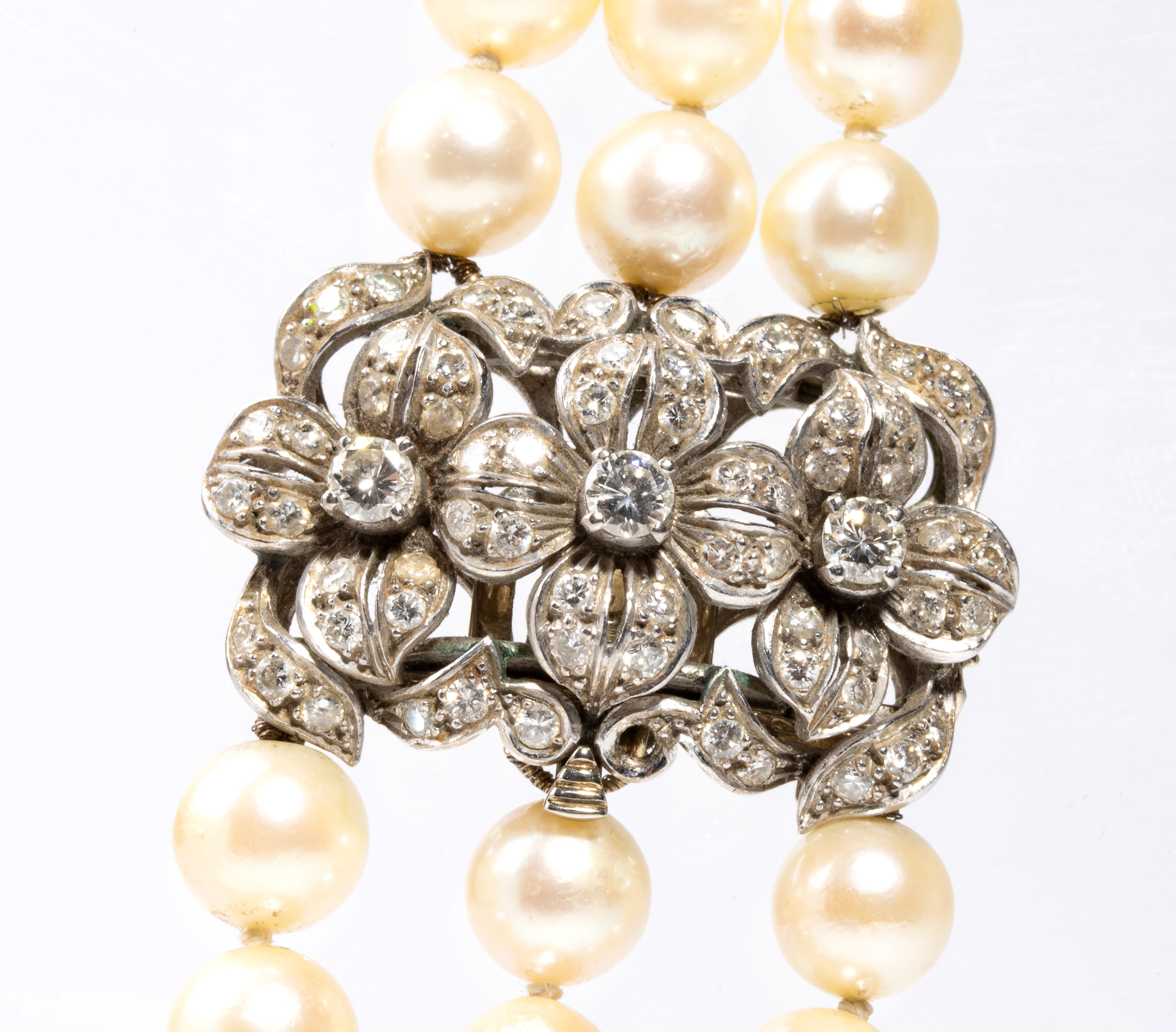 a tre fili di perle coltivate d'acqua salata, fermezza in oro bianco 18k a motivi floreali in diamanti diamanti di forma rotonda, taglio brillante, stimati per un peso totale di circa 2.00 ct, colore G-H, purezza VS-SI.