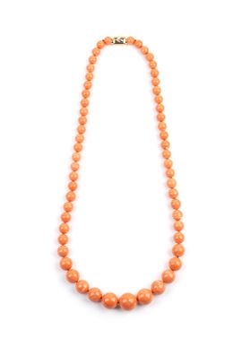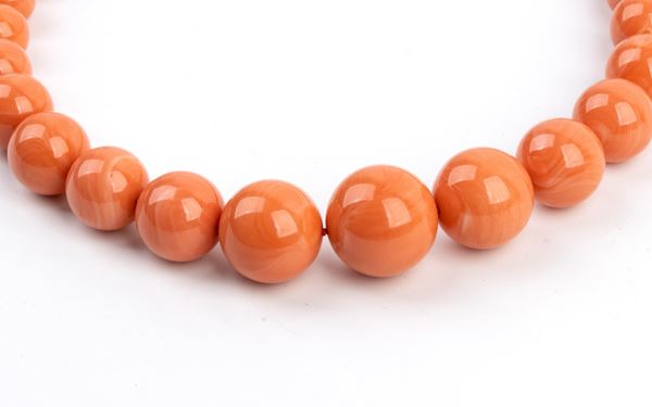 ad un filo di sfere di corallo Cerasuolo colore rosa salmone intenso (Corallium Elatius) disposte in gradazione; fermezza in oro giallo ed oro bianco 18k, con piccolo motivo vegetale in diamanti.