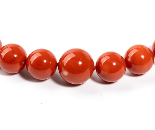 Punzonato “750”. Diametro corallo: 13 -12 - 11 - 10 mm. Lunghezza collana: 61 cm. Lunghezza pendente: 5.5 cm. Peso: 114.5 gr.