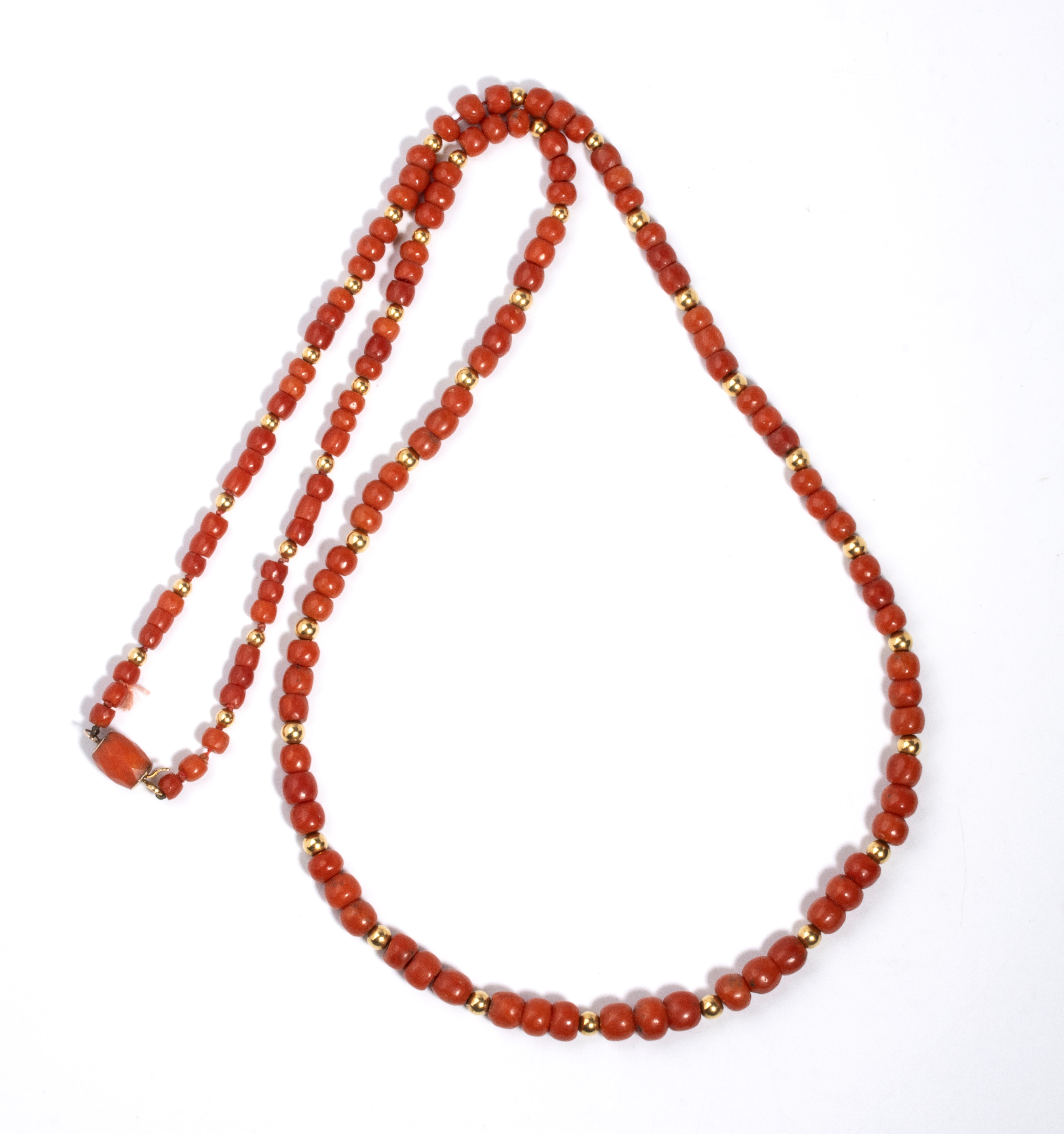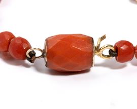 ad un filo di barilotti sfaccettati di corallo Mediterraneo (Corallum Rubrum) disposti in gradazione ed interrotti da sferette in oro giallo.