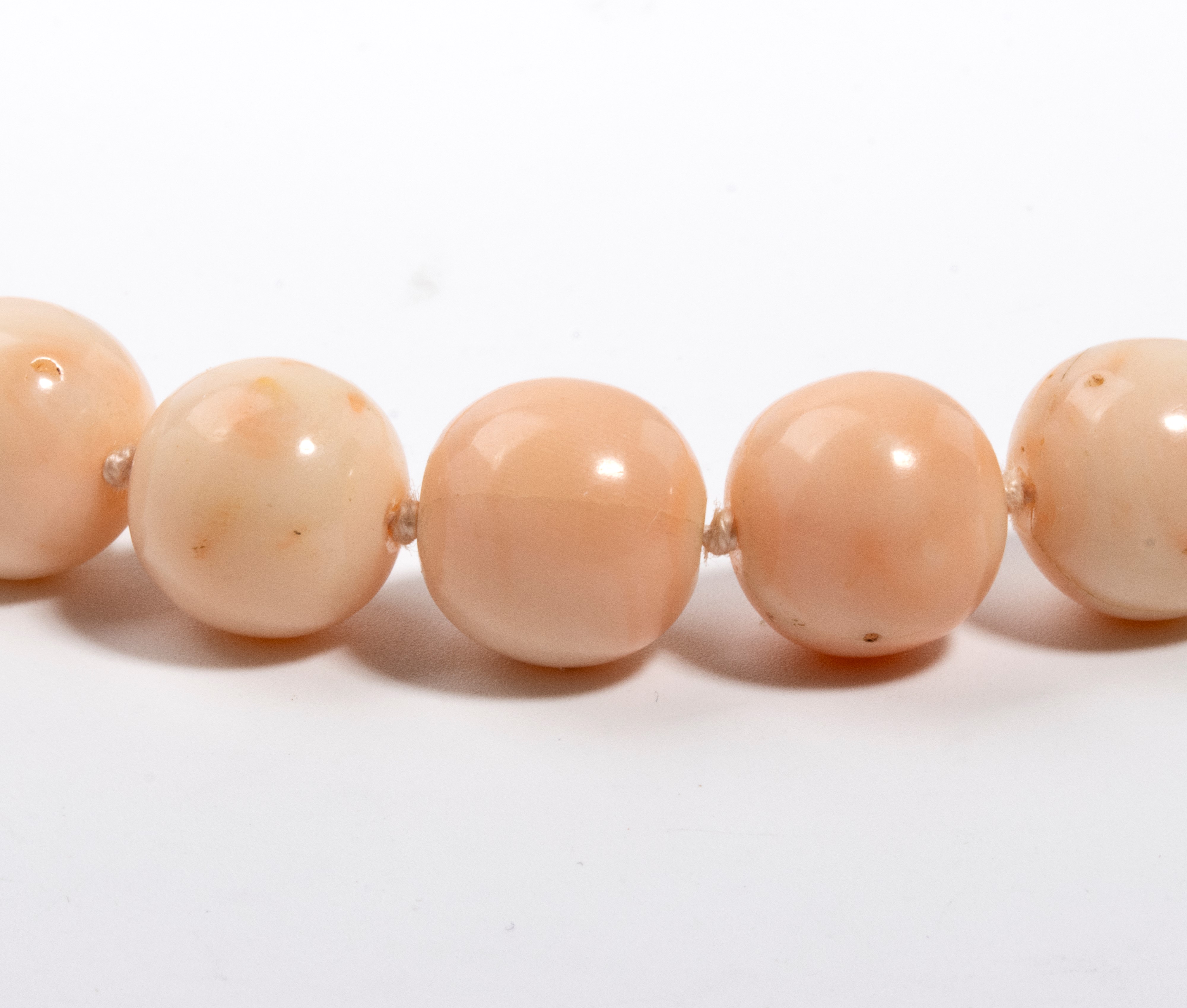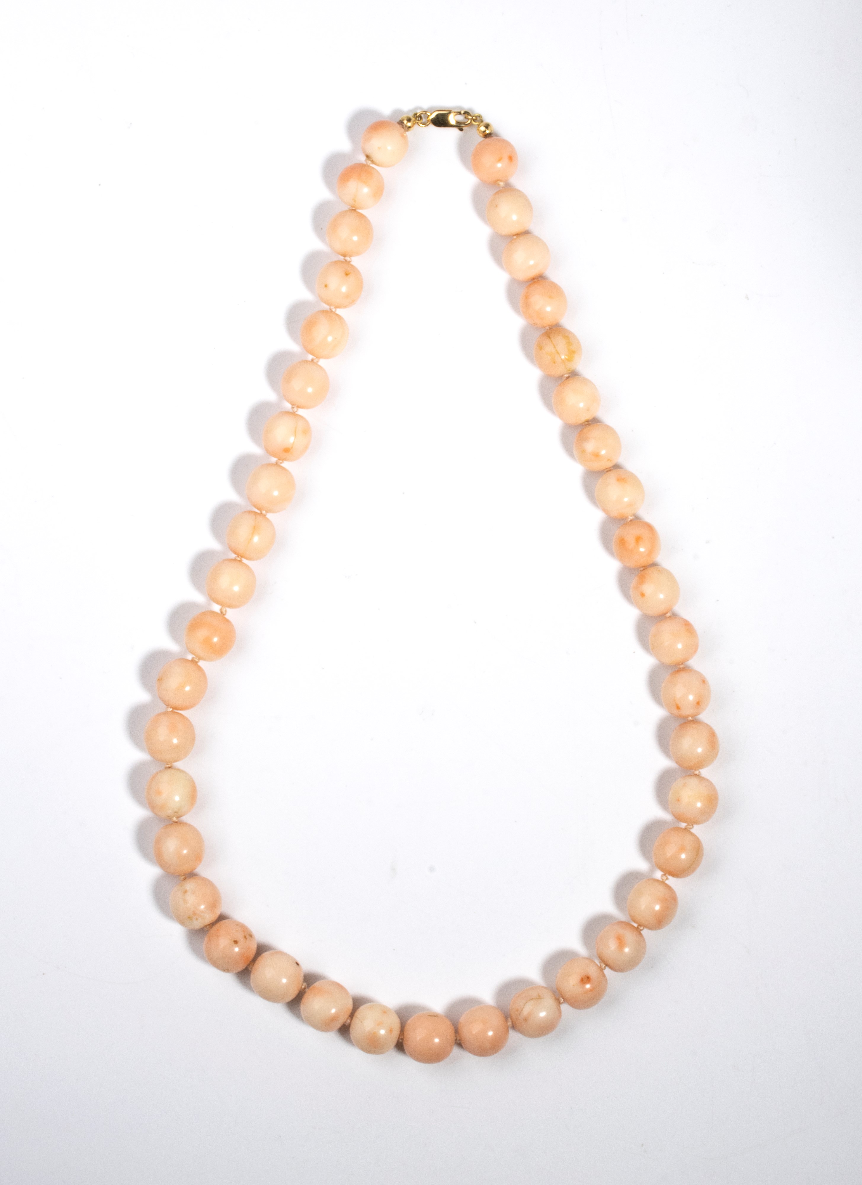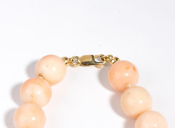 ad un filo di sfere di corallo rosa (Corallium Sp. Nov.) disposte in gradazione, fermezza a scomparsa in oro giallo 18k.